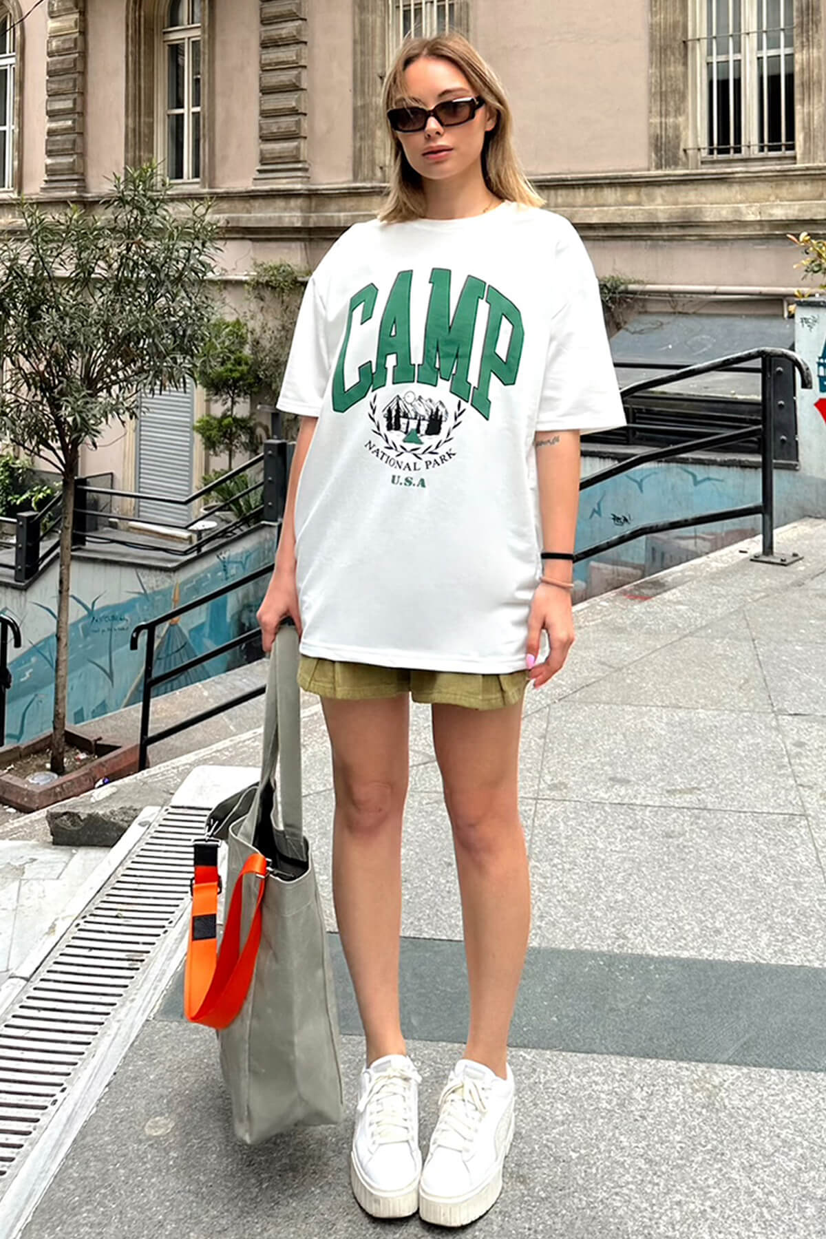 | Beyaz Camp Baskılı Oversize Kadın Tshirt | |
