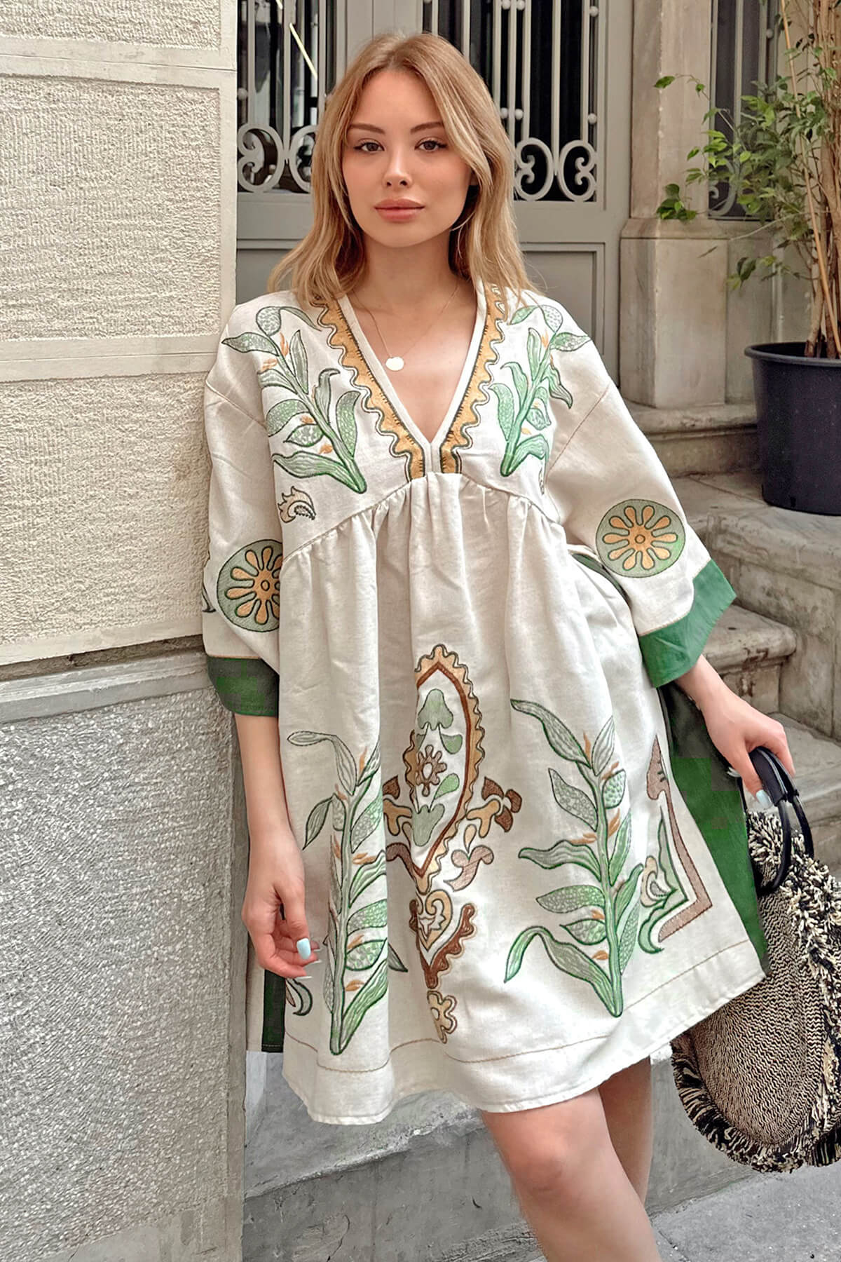| Bej Nakışlı V Yaka Ham Keten Kadın Mini Elbise | |