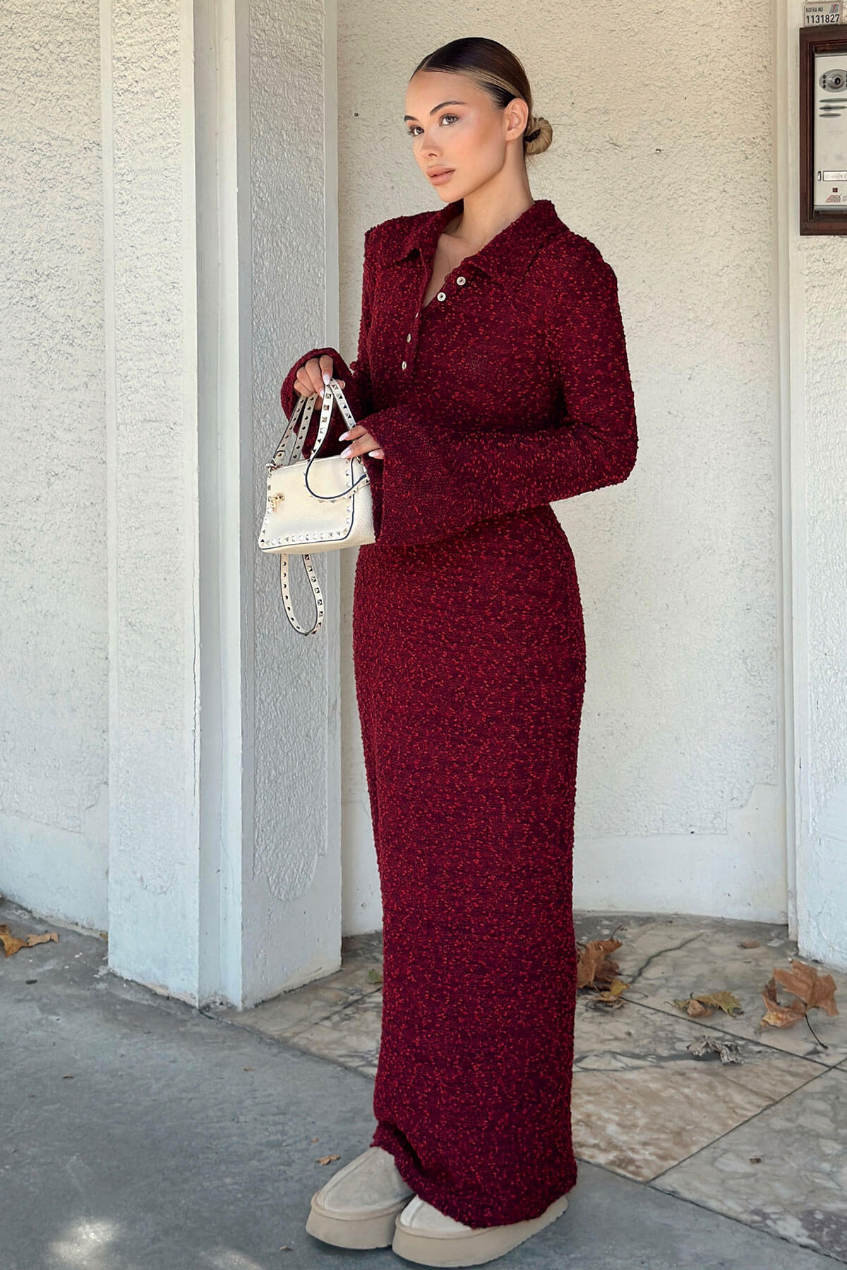 | Bordo Polo Yaka Kabartma Örgü İspanyol Kol Kadın Triko Midi Elbise | |