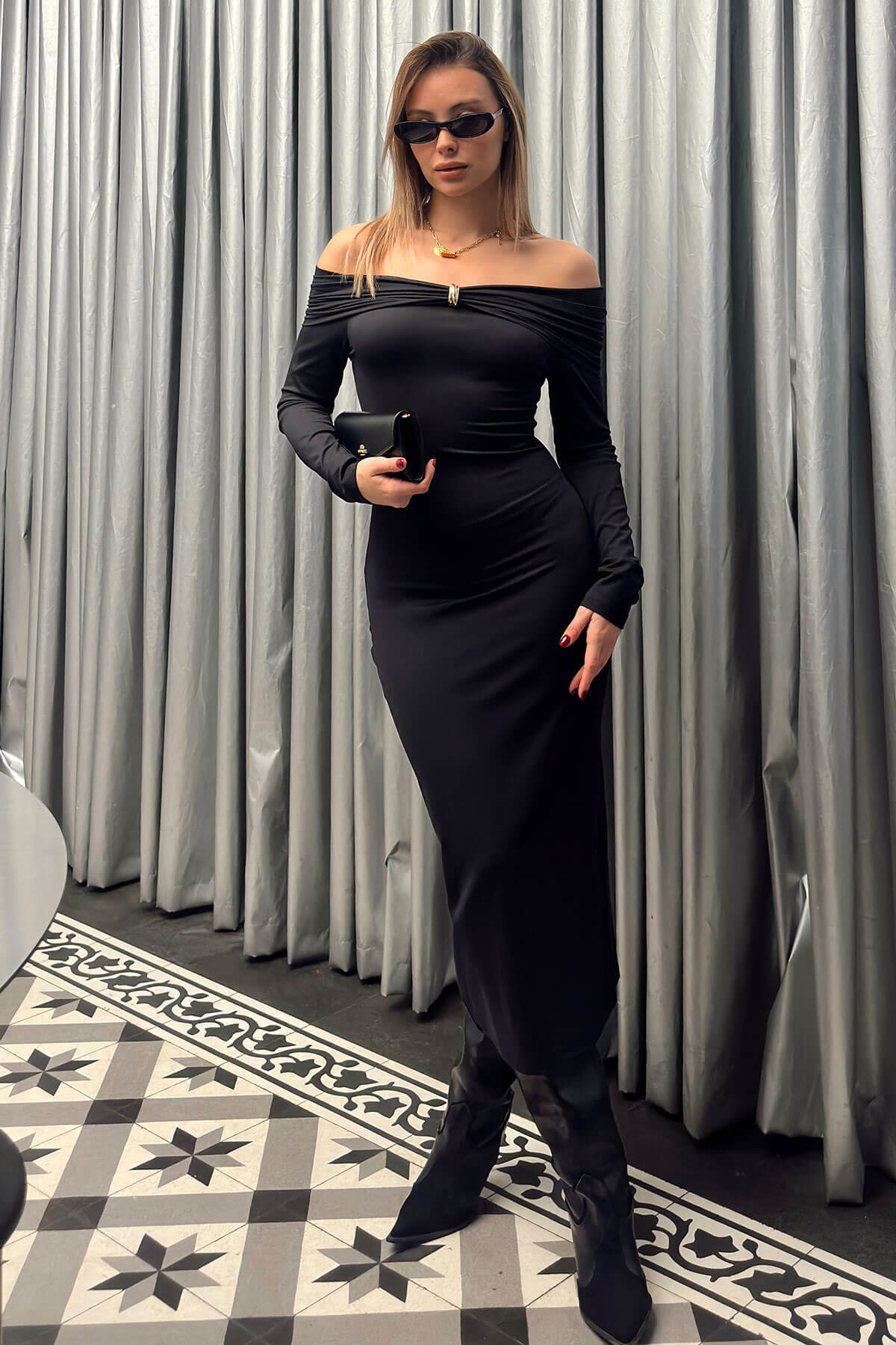 | Siyah Toka Detaylı Madonna Yaka Uzun Kollu Kadın Sandy Midi Elbise | |