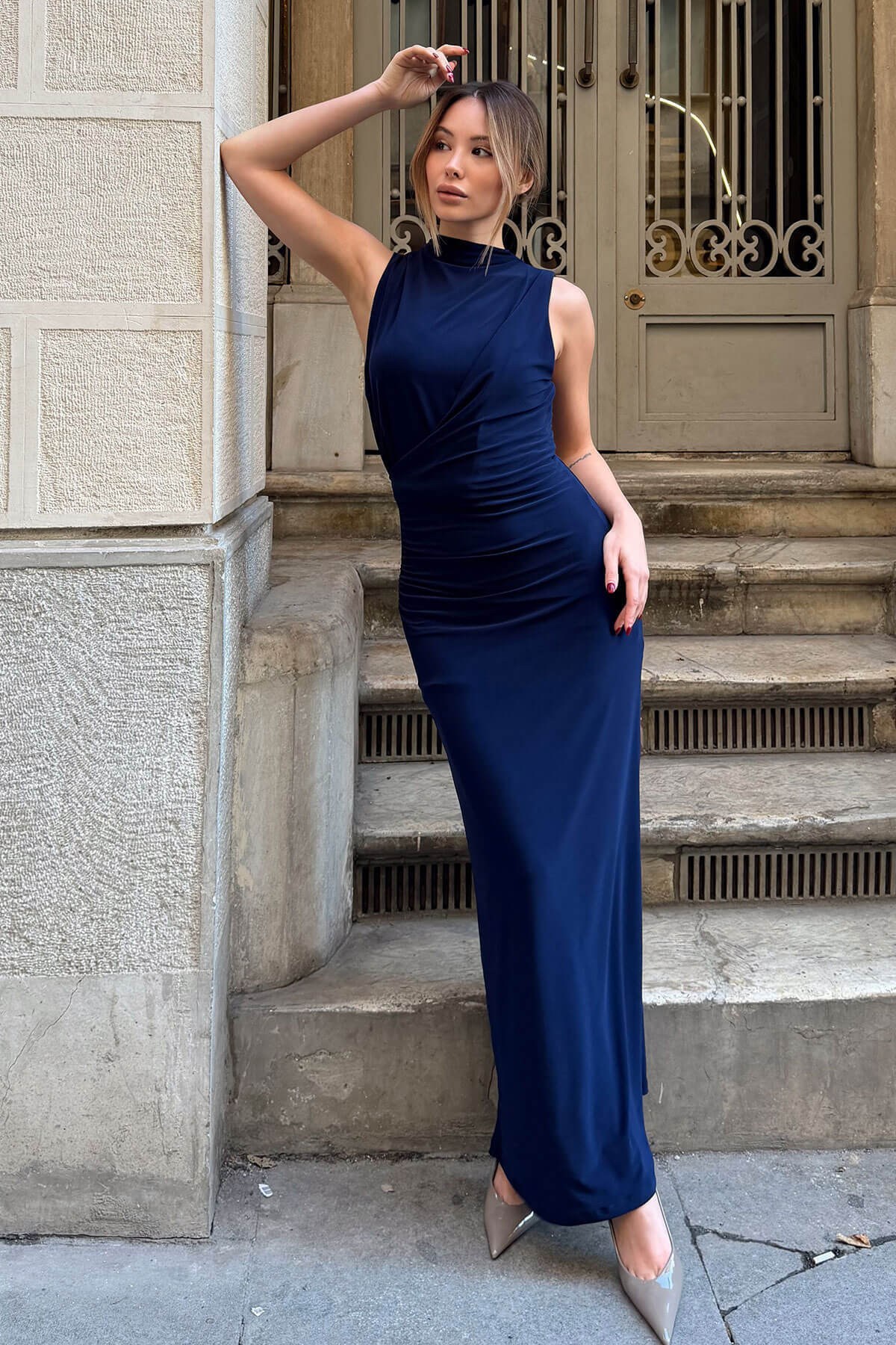 | Lacivert Sassy Kolsuz Bel Drapeli Yırtmaçlı Kadın Elbise | |