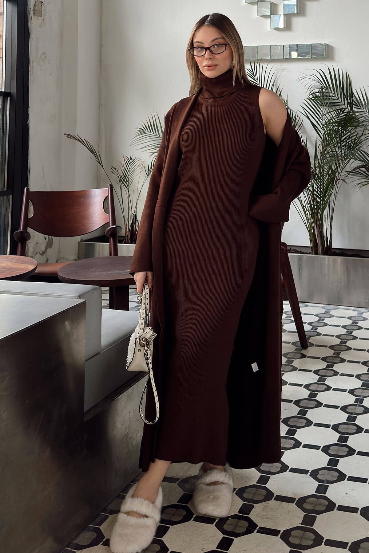 | Kahverengi Balıkçı Yaka Sıfır Kol Midi Elbise-Hırka Kadın Triko Takım | |
