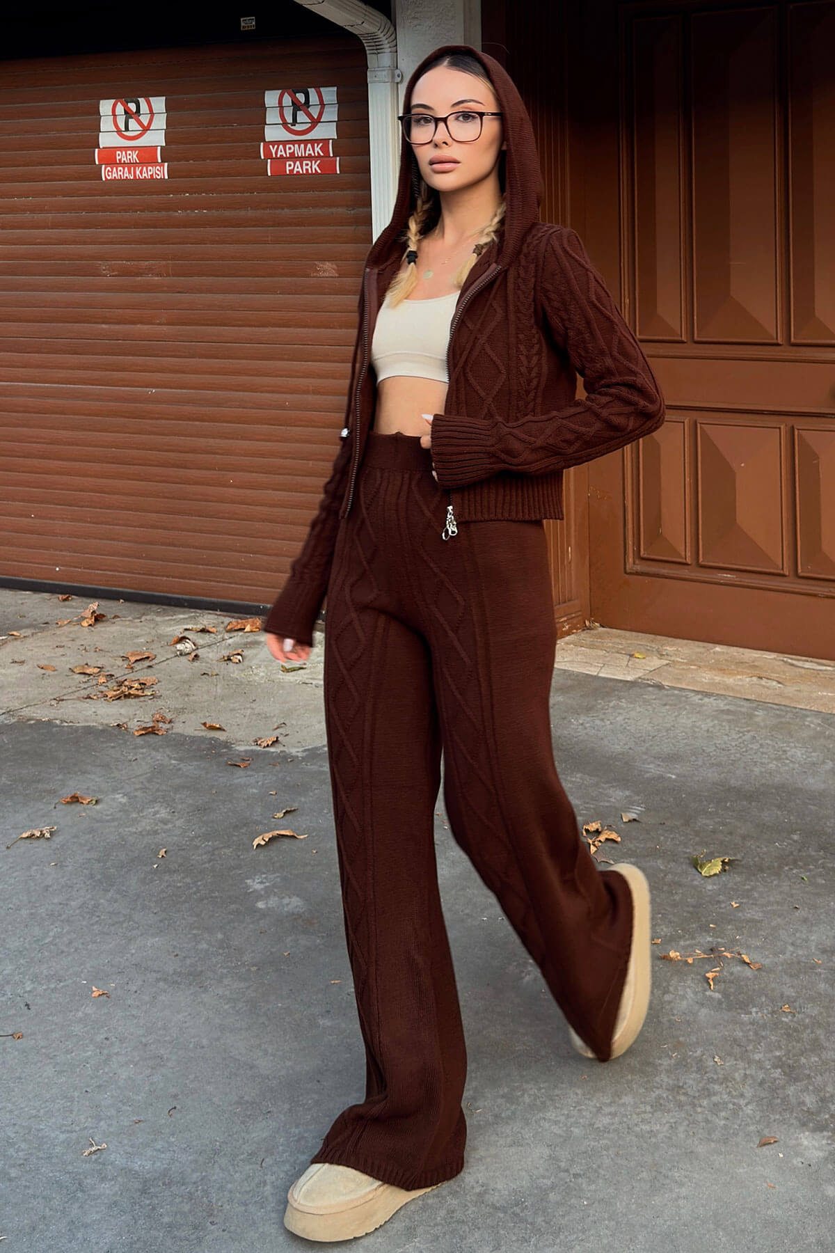| Kahverengi Kapüşonlu Hırka Pantolon Desenli Kadın Triko Alt-Üst Takım | |