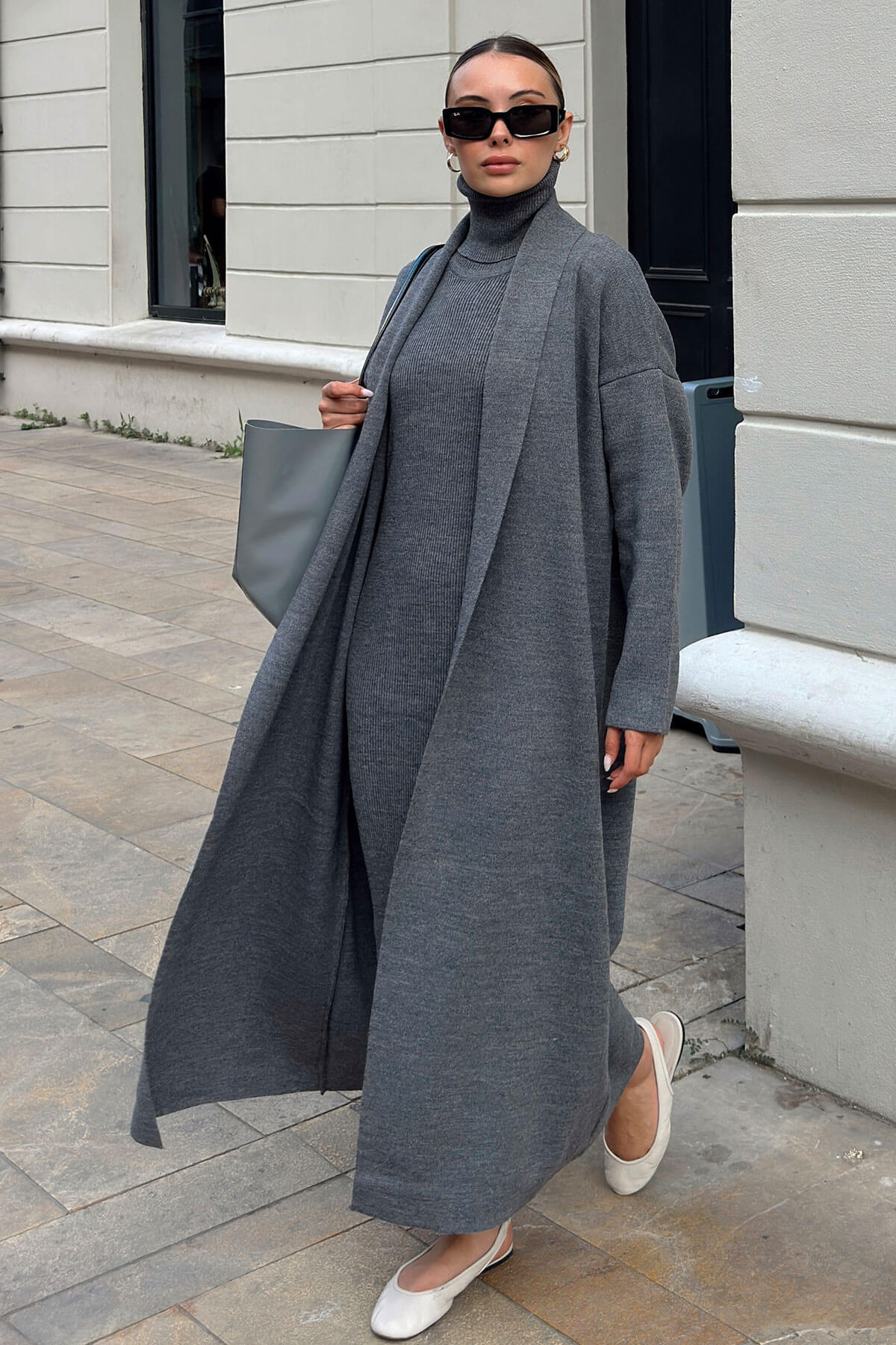 | Füme Balıkçı Yaka Sıfır Kol Midi Elbise-Hırka Kadın Triko Takım | |