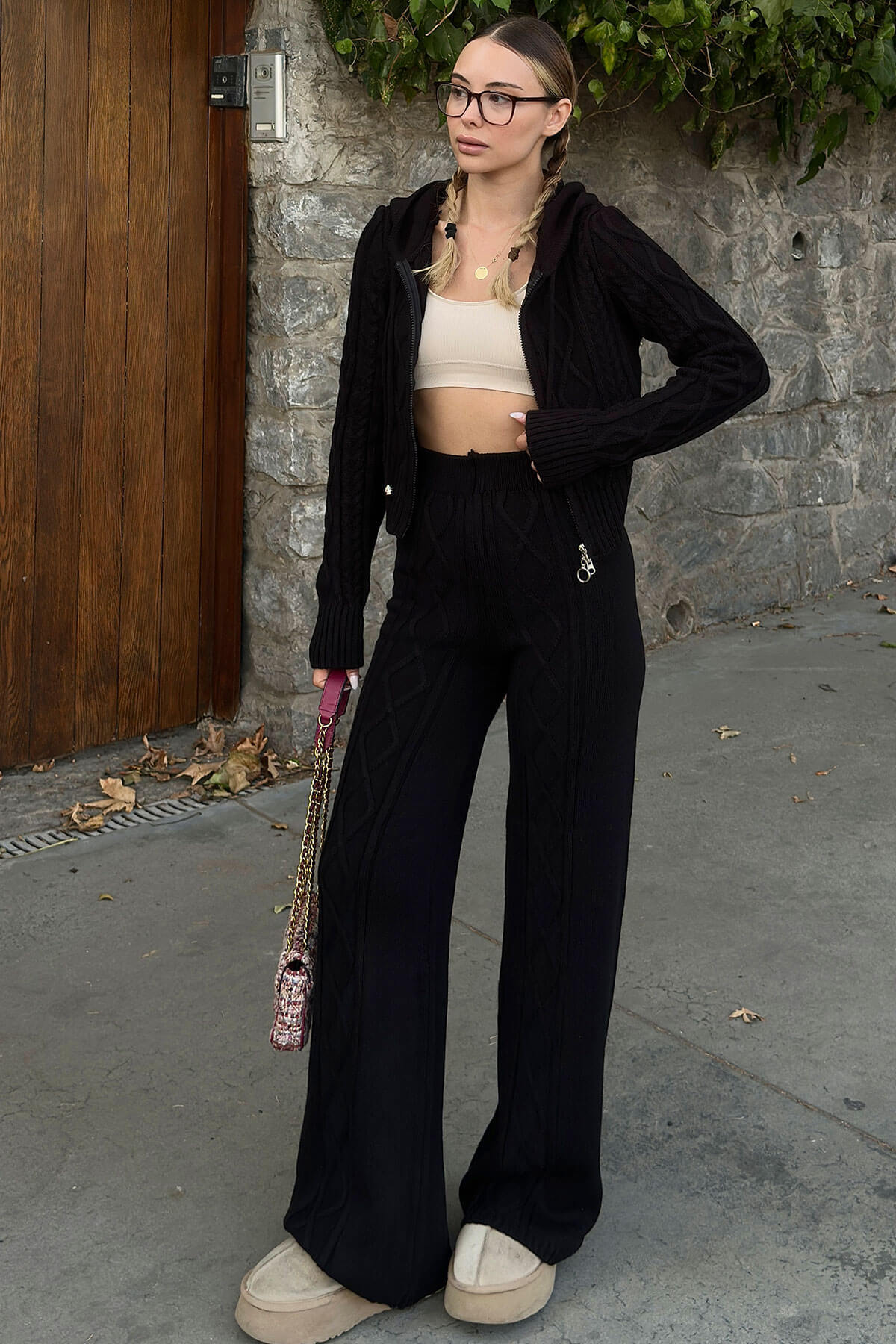| Siyah Kapüşonlu Hırka Pantolon Desenli Kadın Triko Alt-Üst Takım | |