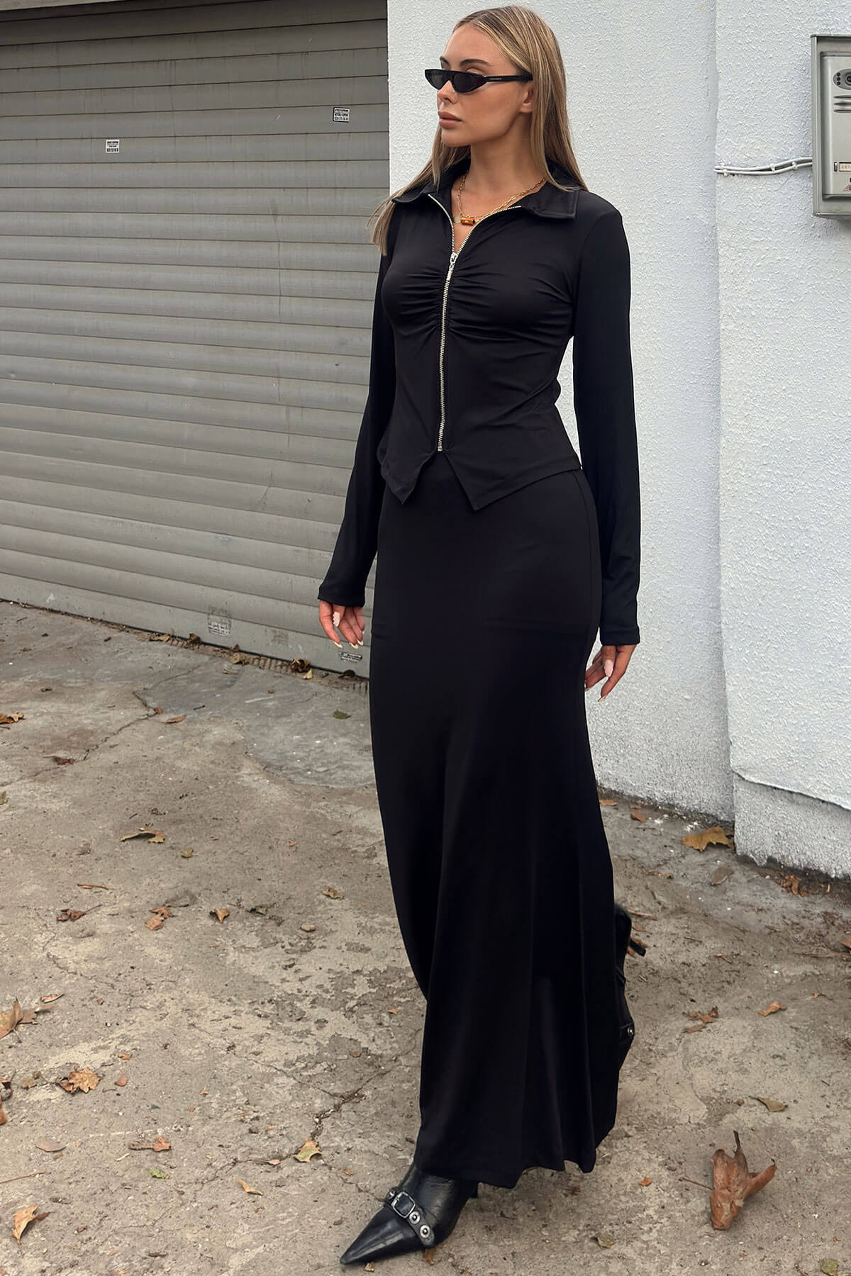 | Siyah Rana Polo Yaka Fermuarlı Crop- Midi Boy Etek Kadın Alt Üst Takım | |