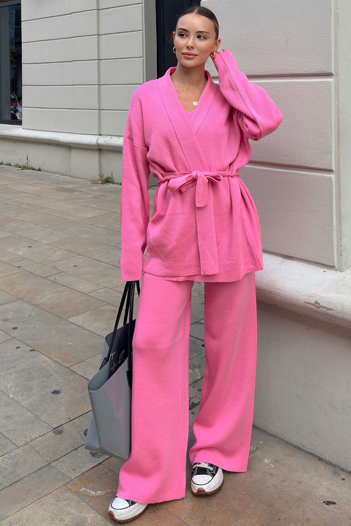 | Pembe Kuşaklı Hırka-Askılı Crop-Pantolon 3'lü Kadın Triko Takım | |