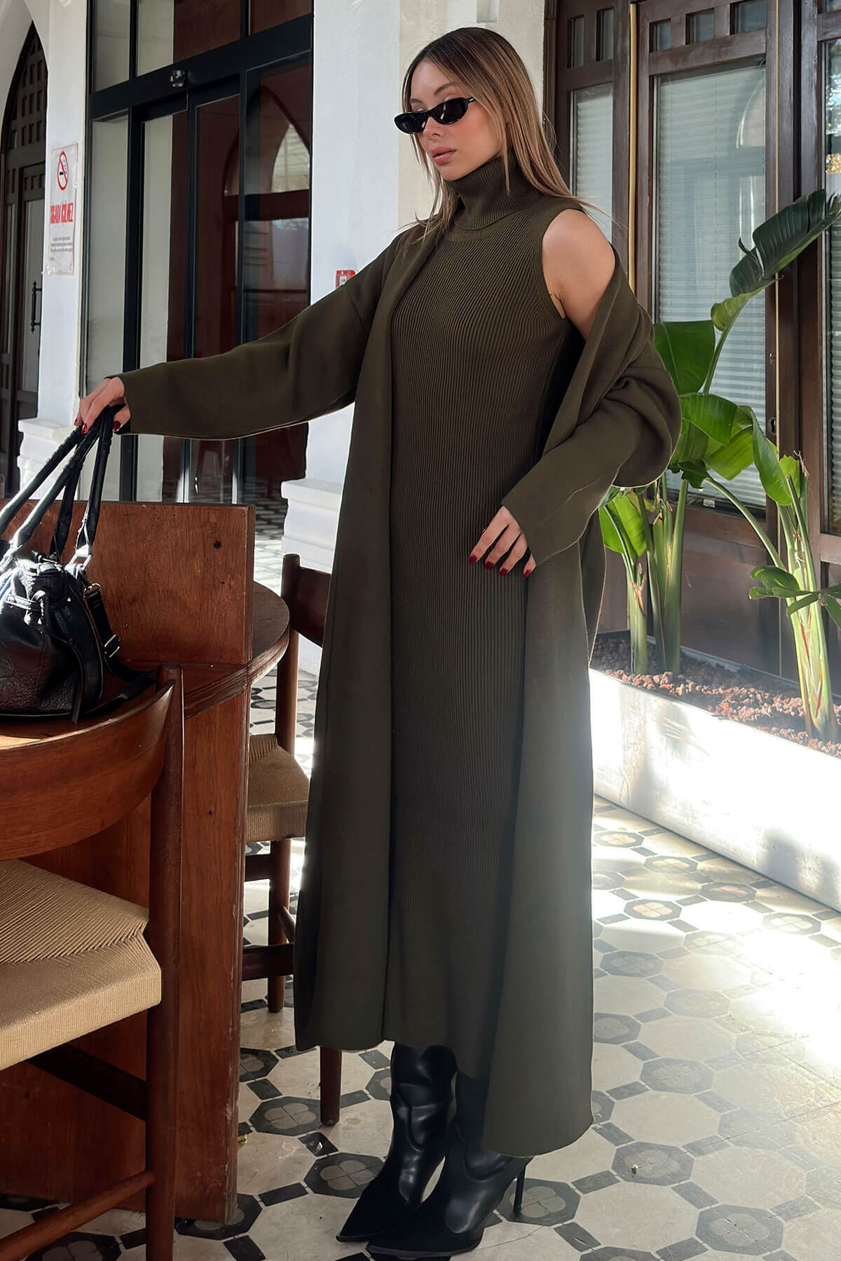 | Haki Balıkçı Yaka Sıfır Kol Midi Elbise-Hırka Kadın Triko Takım | |