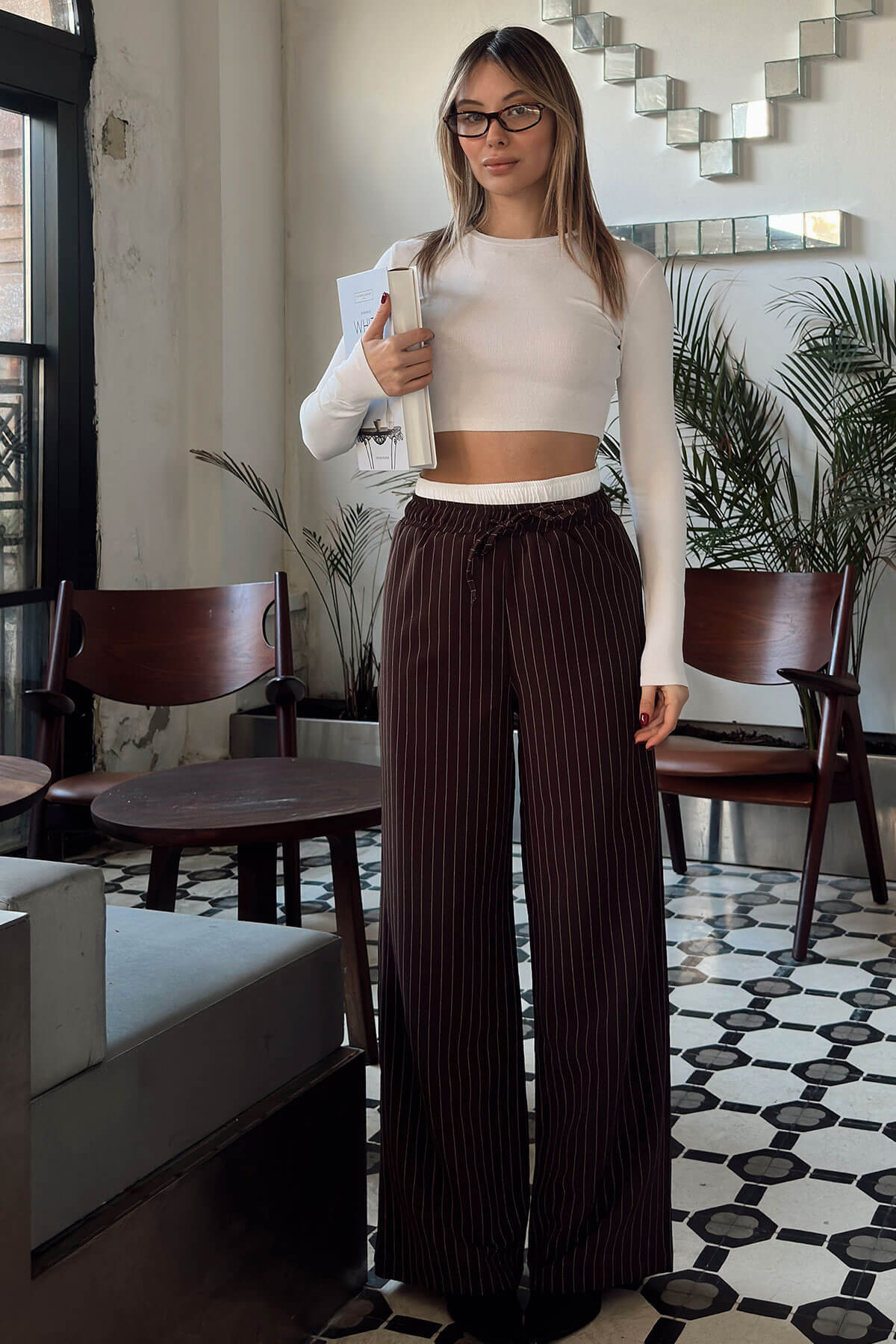 | Kahverengi Çizgili Maskülen Bağlamalı Kadın Pantolon | |