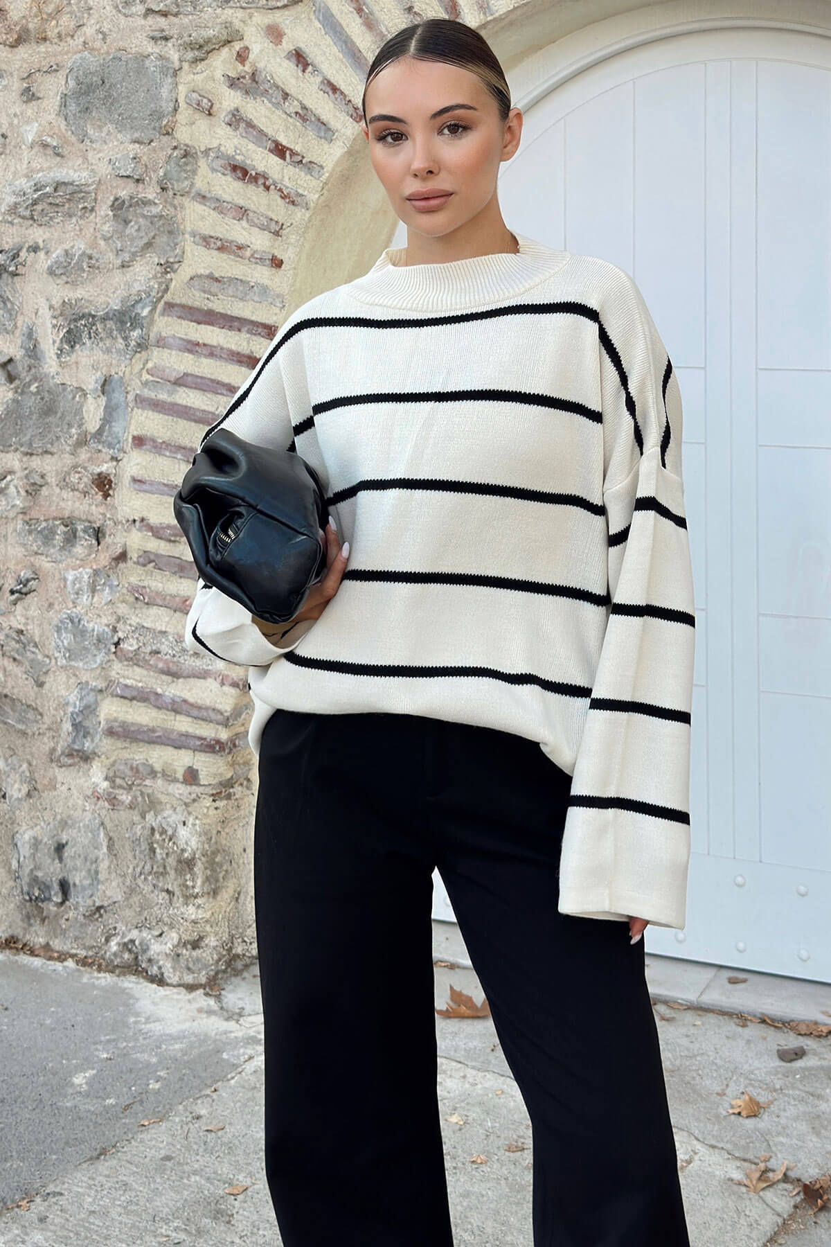 | Bej Çizgili Yarım Balıkçı Oversize Uzun Kadın Triko Kazak | |
