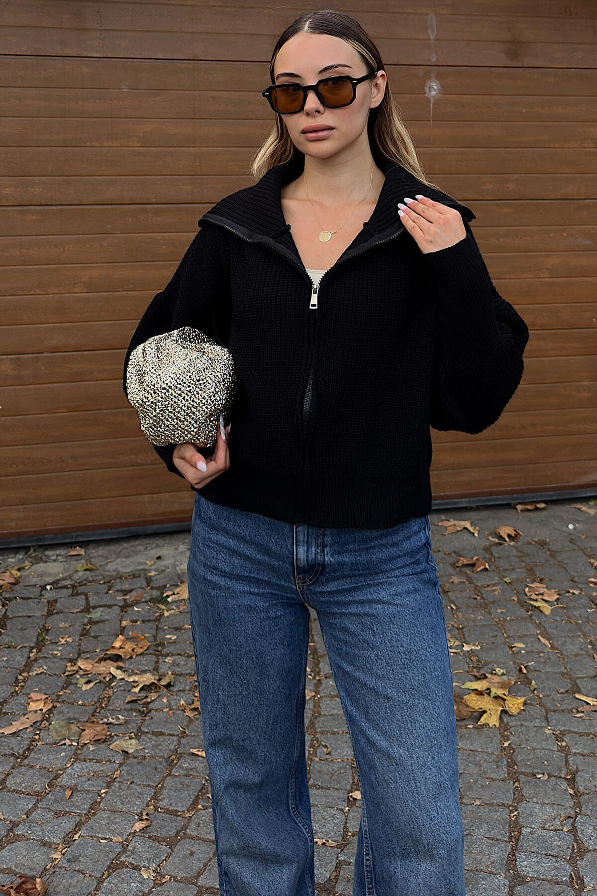 | Siyah Yulia Fermuarlı Yaka Kadın Triko Crop Hırka | |