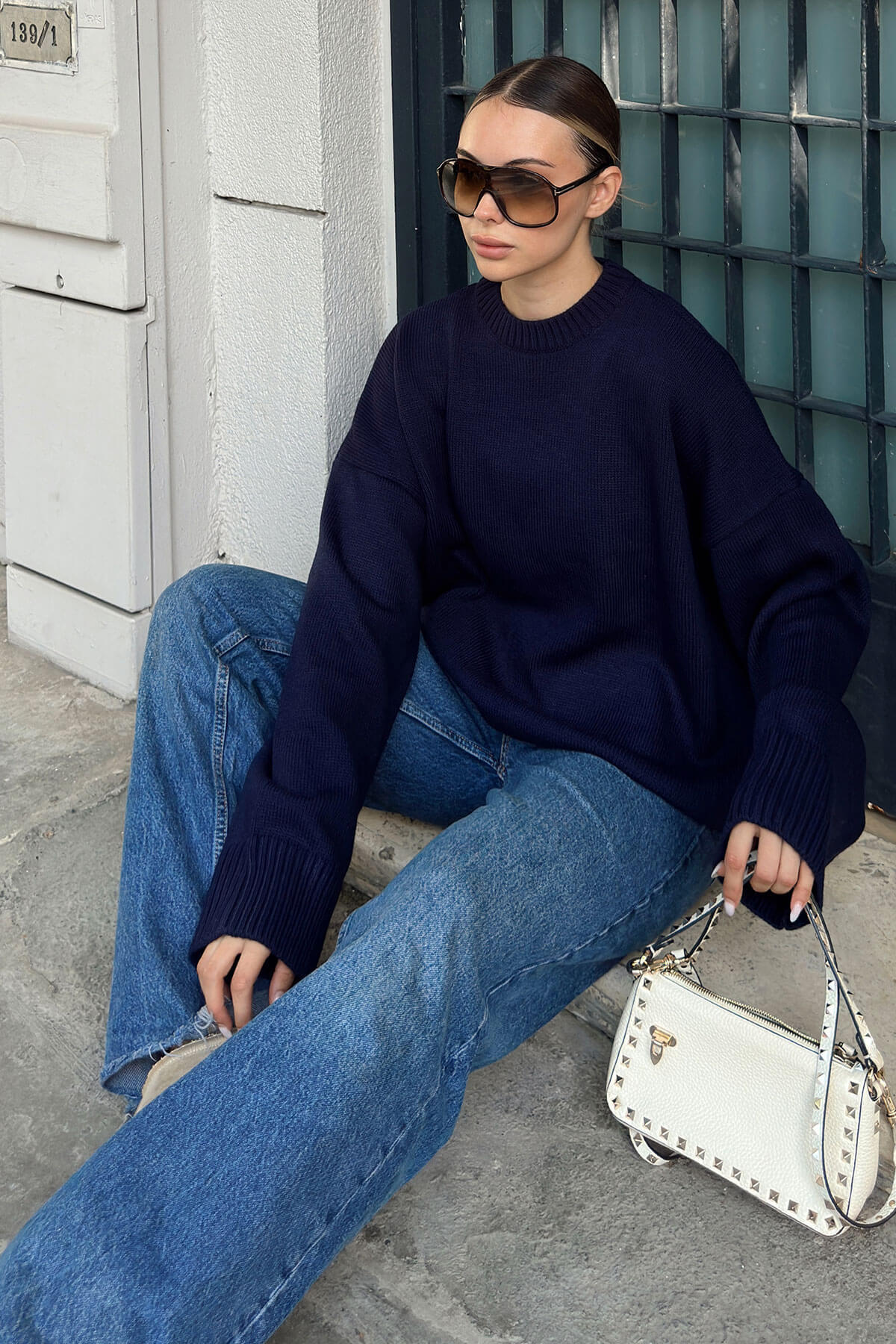 | Lacivert Biscuit Bisiklet Yaka Oversize Kadın Triko Kazak | |