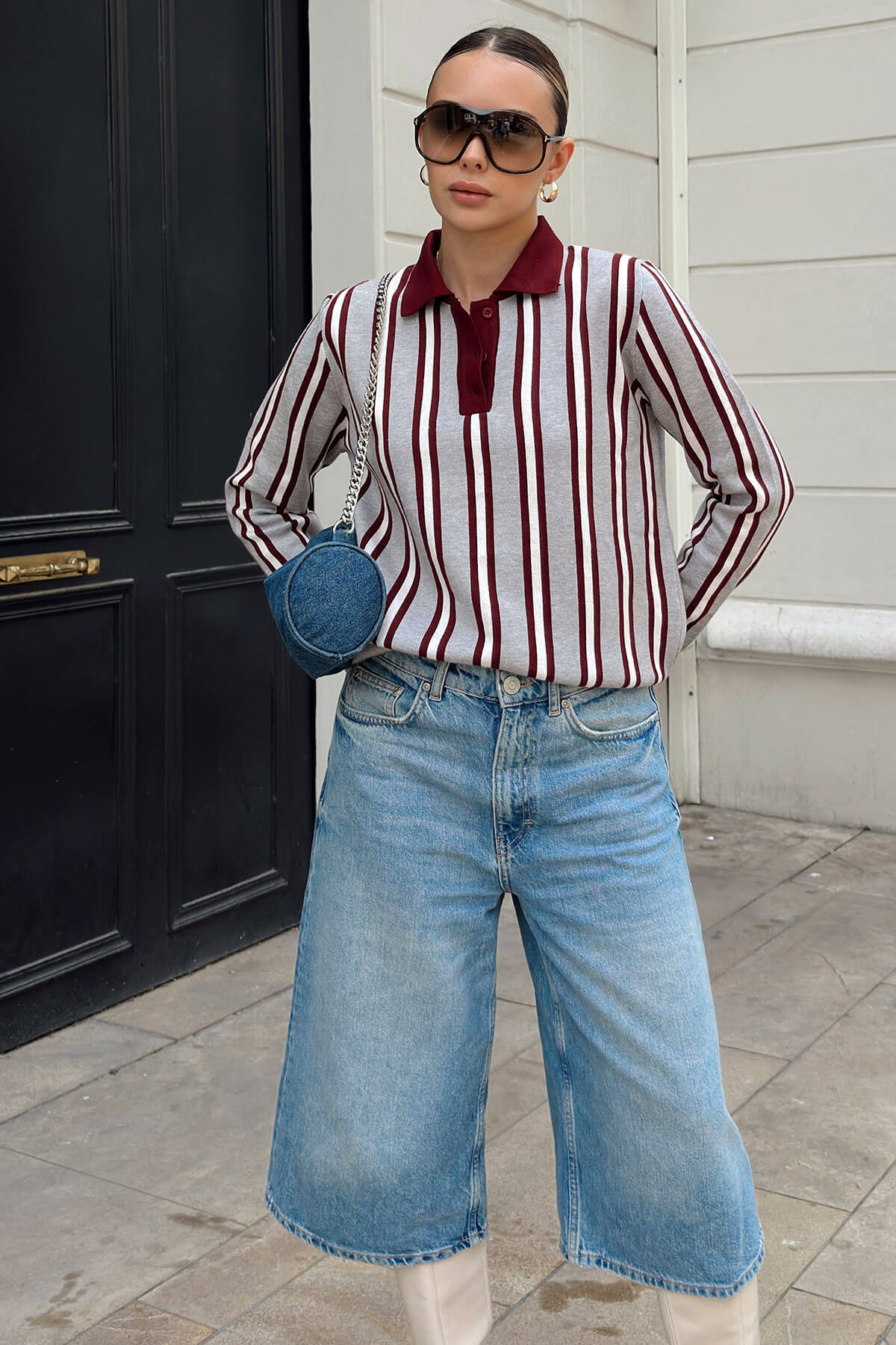 | Bordo Polo Yaka Kalın Çizgili Kadın Triko Kazak | |