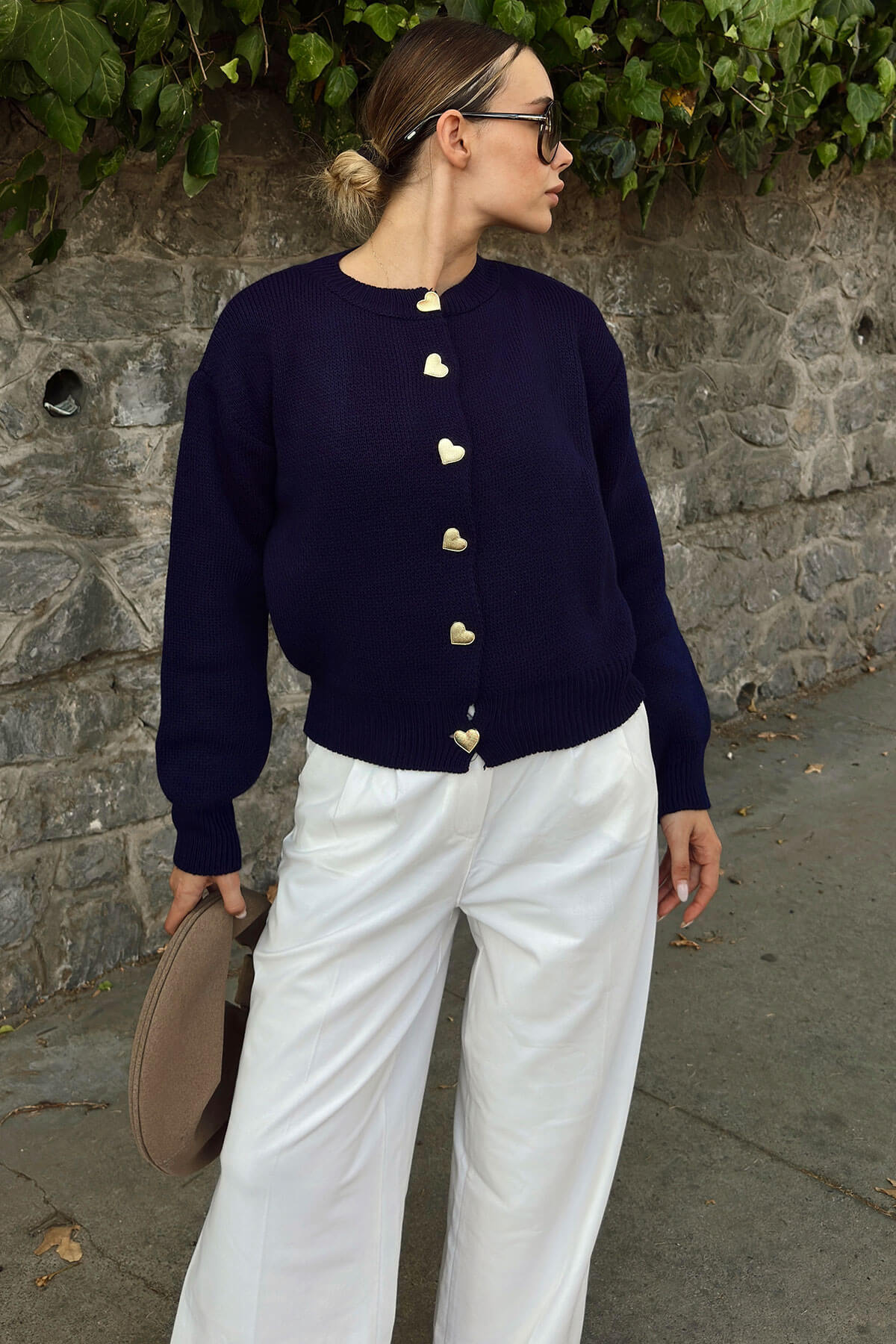 | Lacivert Heart Gold Kalp Düğmeli Kadın Triko Hırka | |