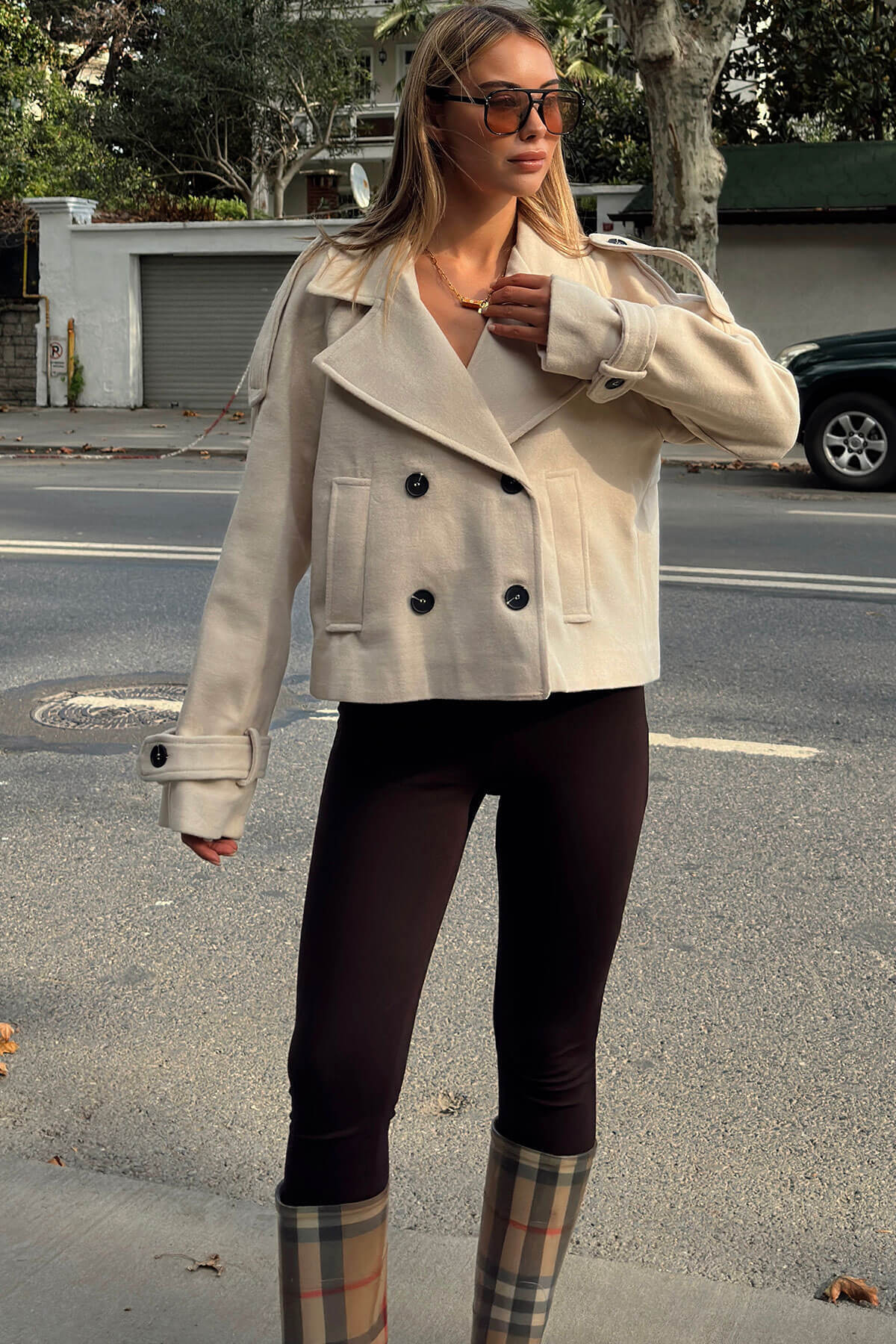 | Bej Kruvaze Apoletli Manşet ve Cep Detaylı Kadın Crop Kaşe Mont | |