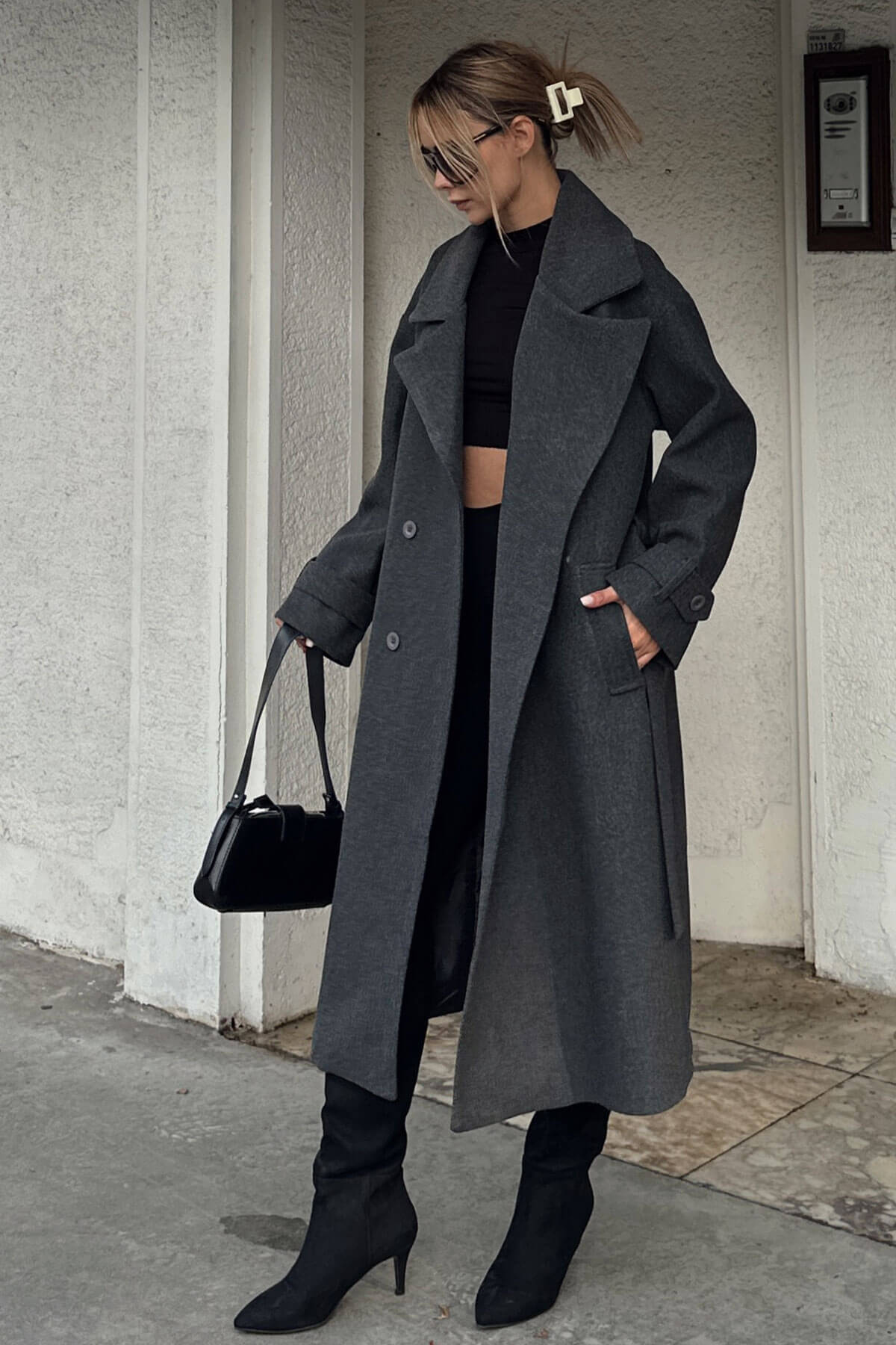 | Füme Kruvaze Kol Manşetli Kuşaklı Astarlı Uzun Kadın Midi Kaşe Kaban | |