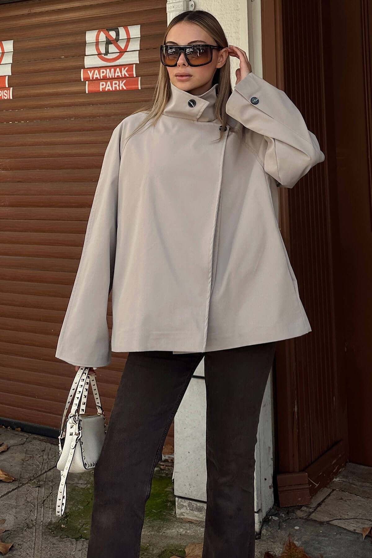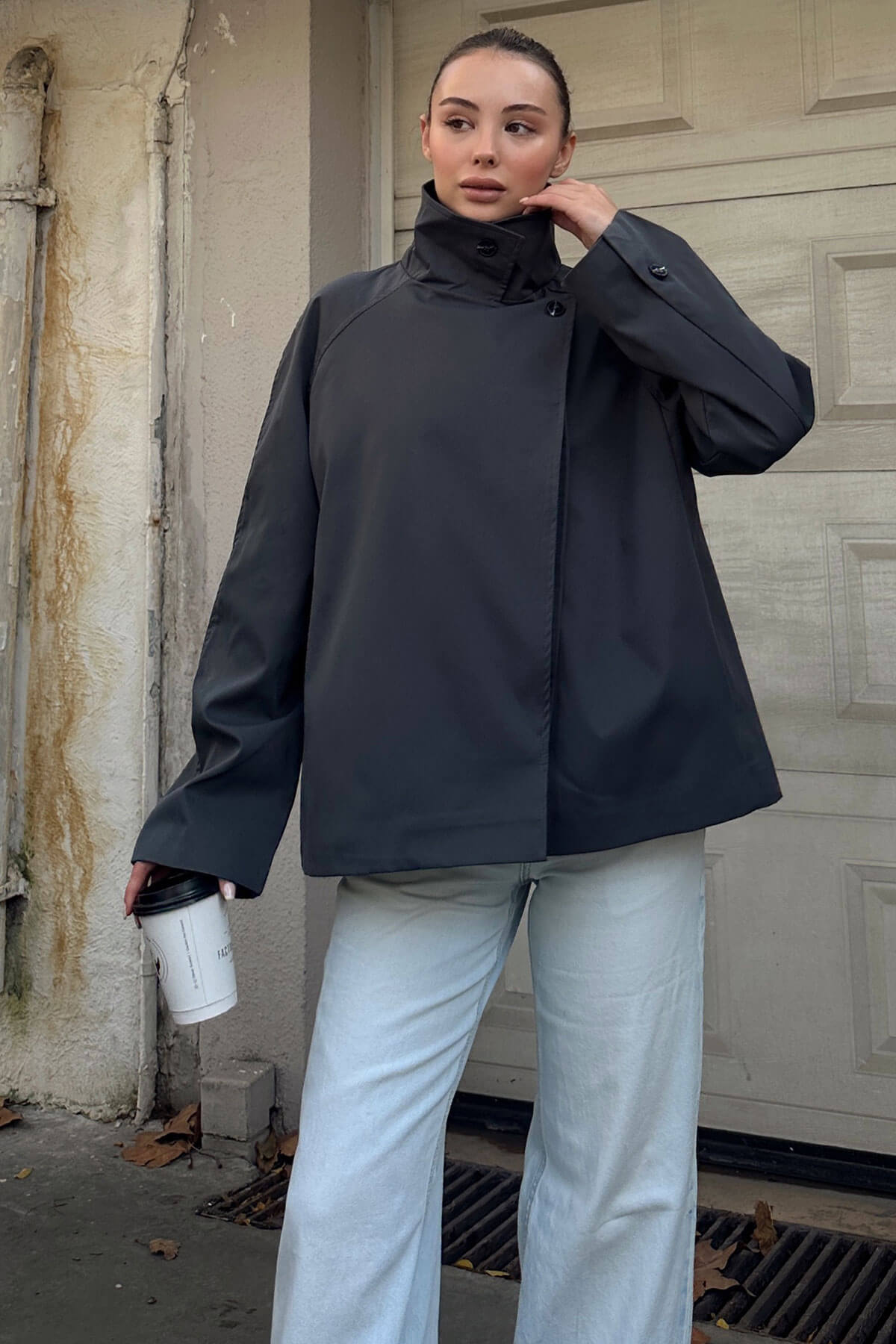| Füme Dik Yaka Verev Kapama Düğme Detaylı Kadın Kısa Trençkot | |