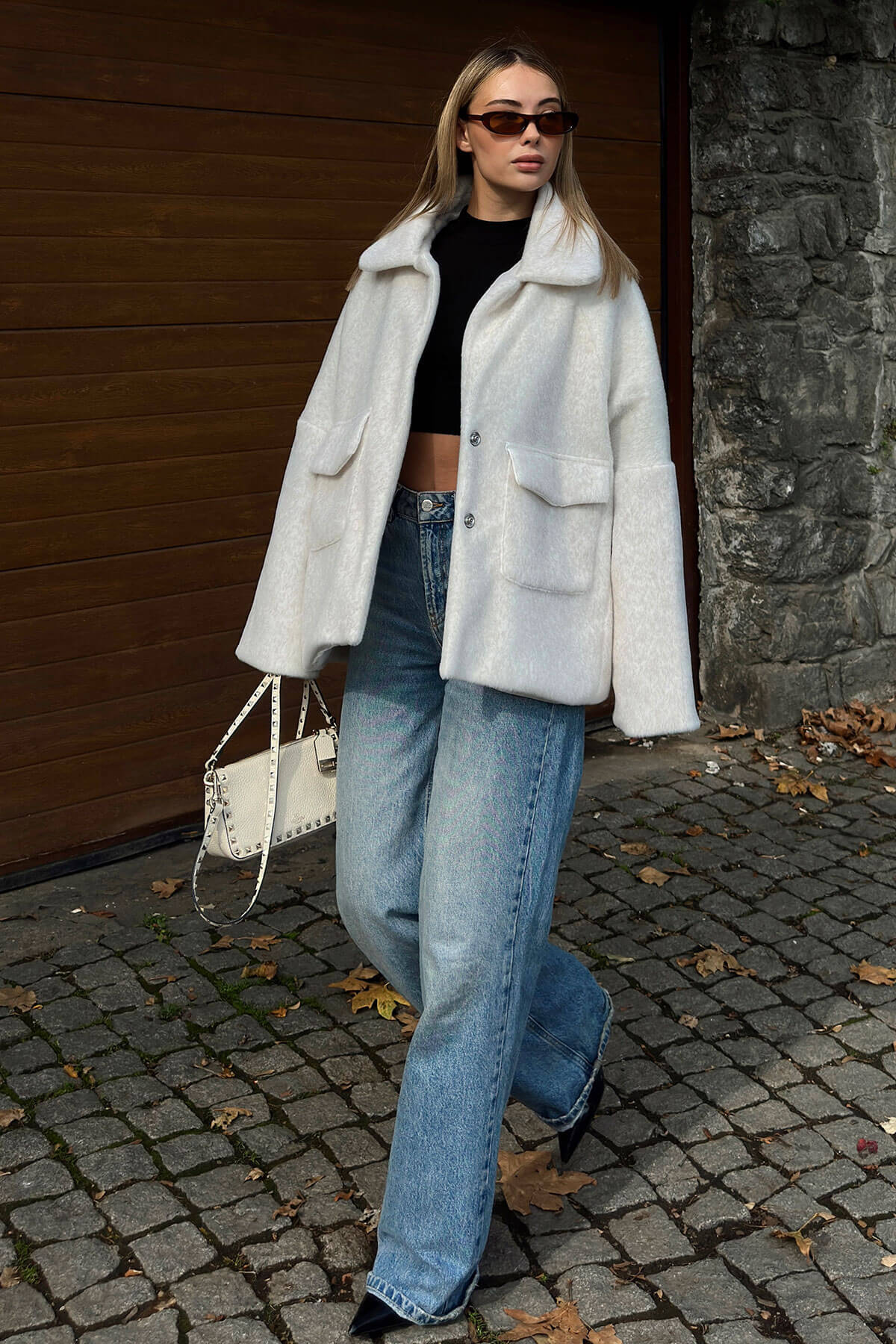 | Vizon Kruvaze Apoletli Manşet ve Cep Detaylı Kadın Crop Kaşe Mont | |