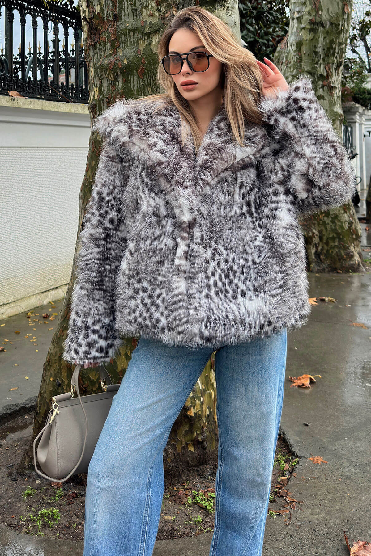 | Gri Leopar Desen Kruvaze Yaka Kadın Peluş Kürk | |