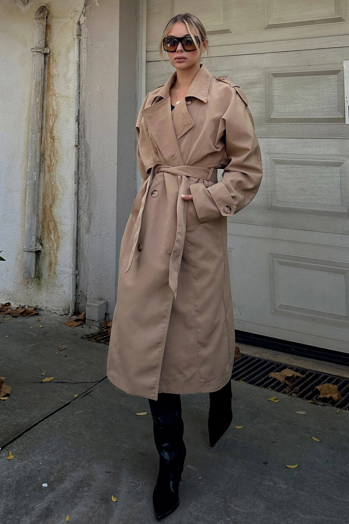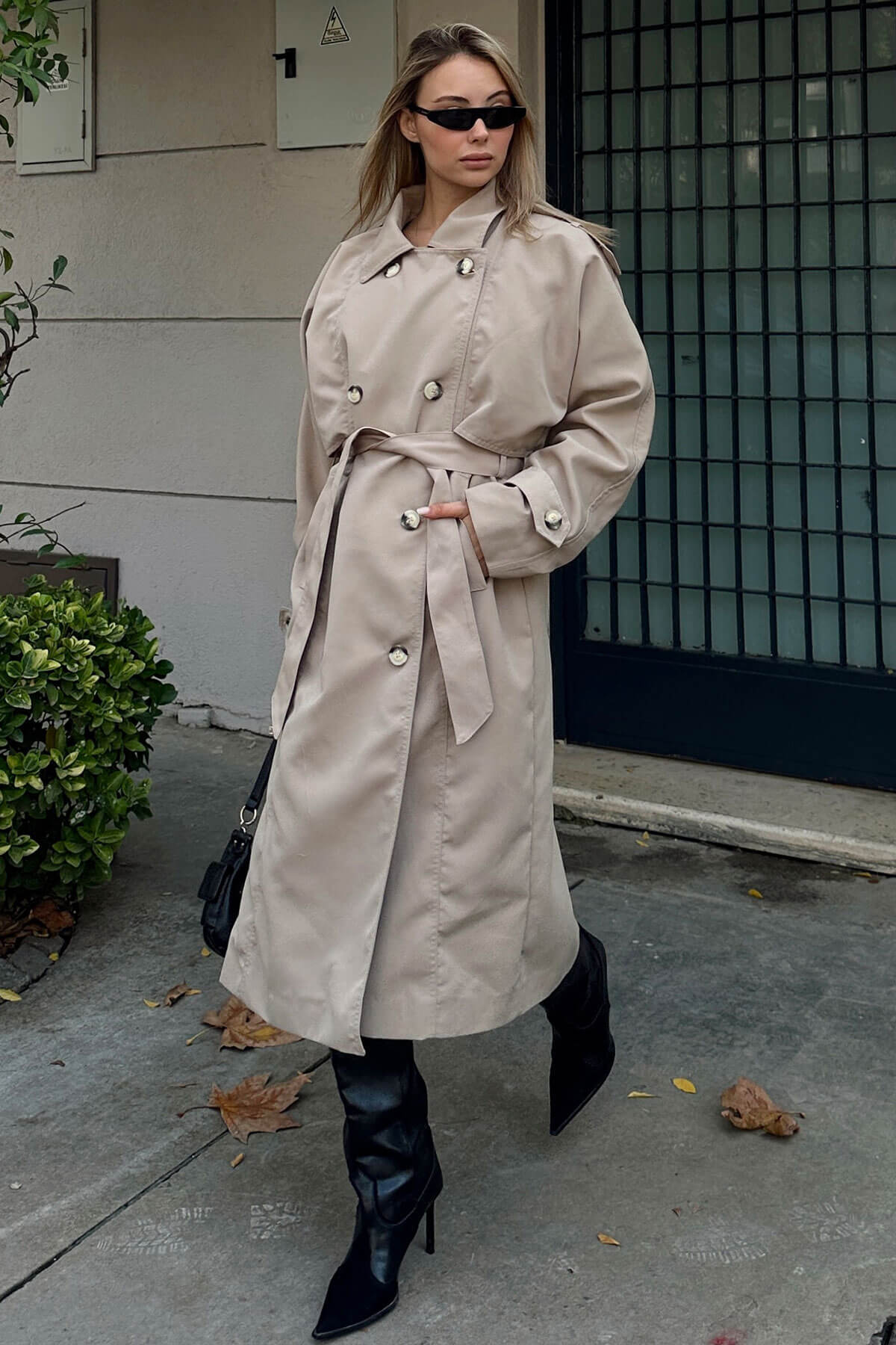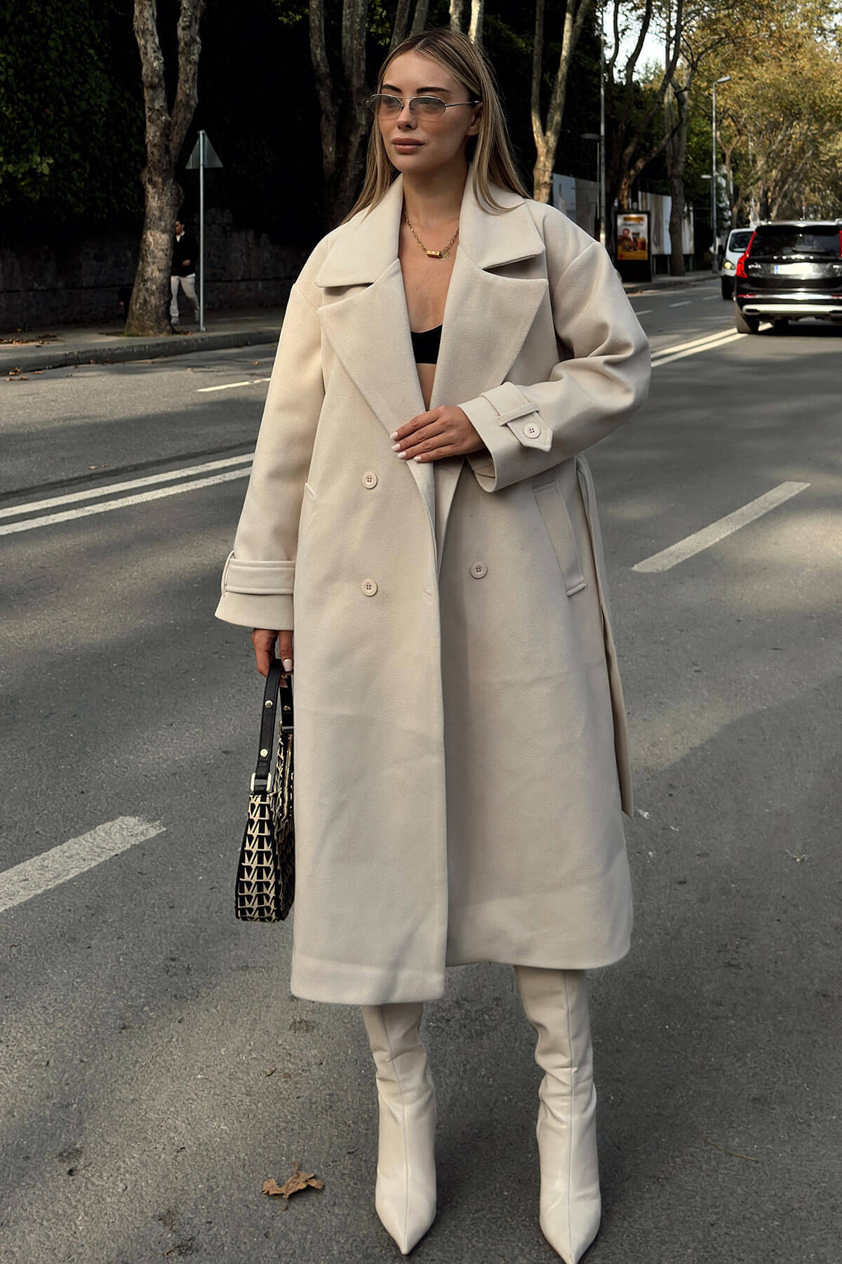 | Bej Oversize Kuşaklı Kruvaze Yaka Apoletli Kadın Midi Trençkot | |
