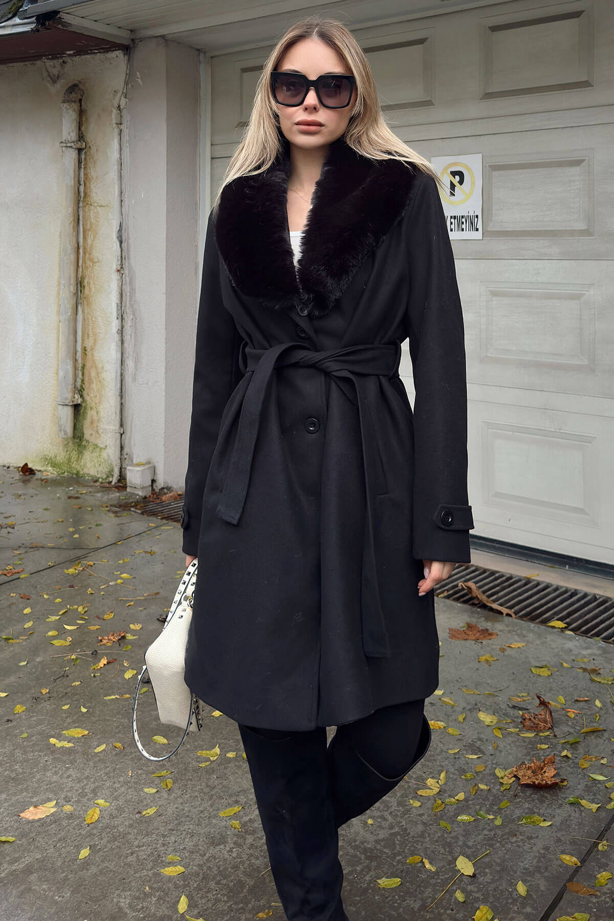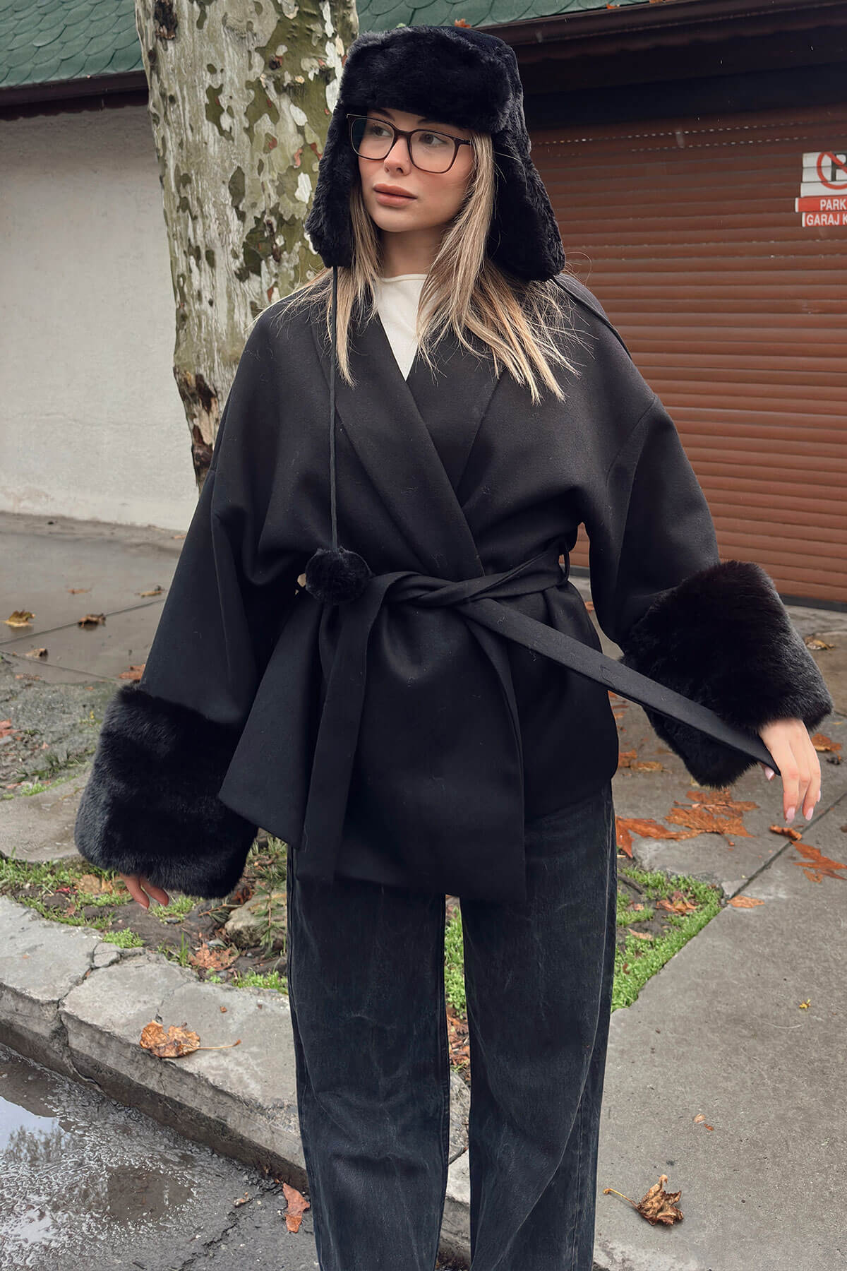 | Siyah Yaka Kürklü Kol Manşet Detay Kuşaklı Kadın Kaşe Kaban | |