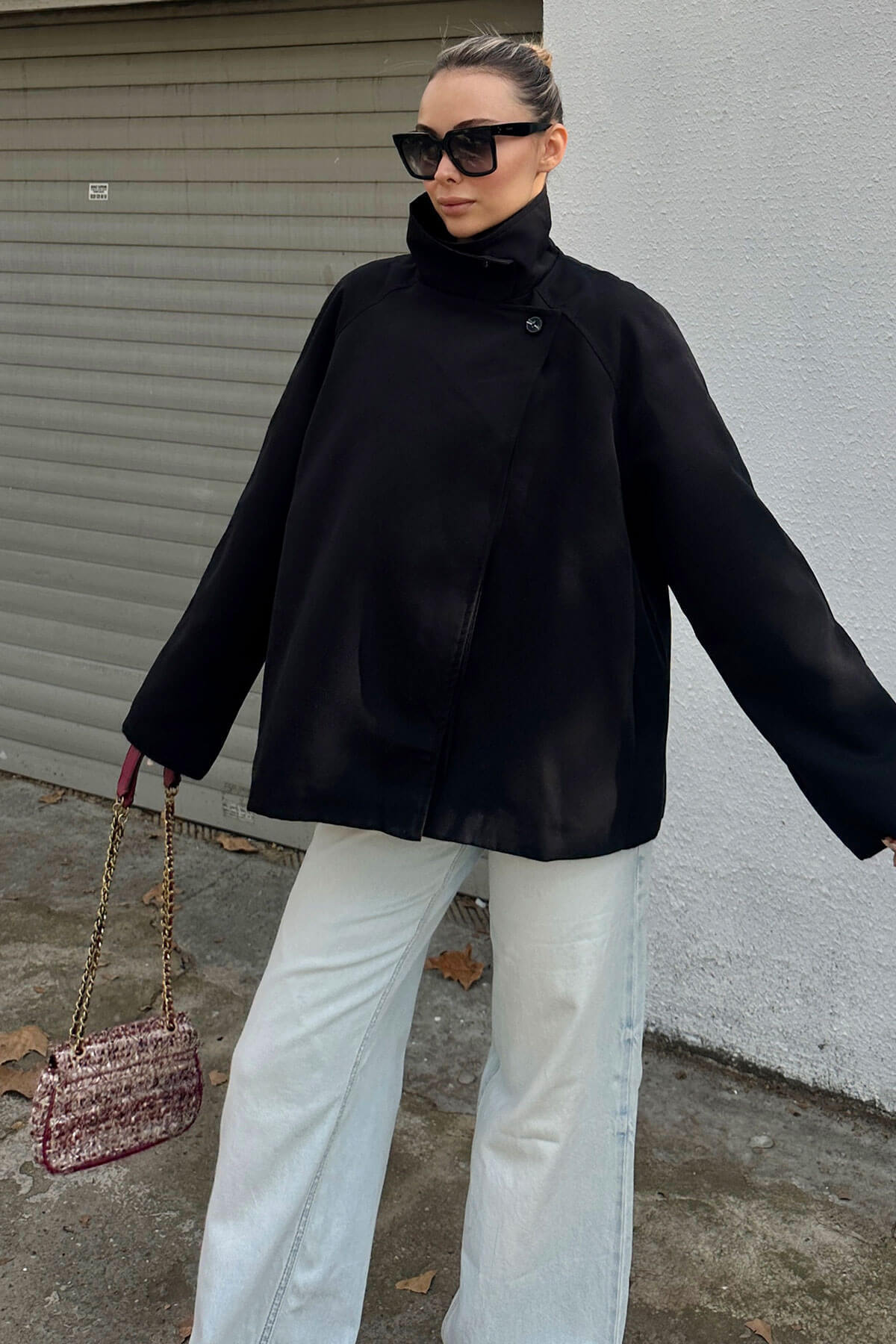 | Siyah Dik Yaka Verev Kapama Düğme Detaylı Kadın Kısa Trençkot | |