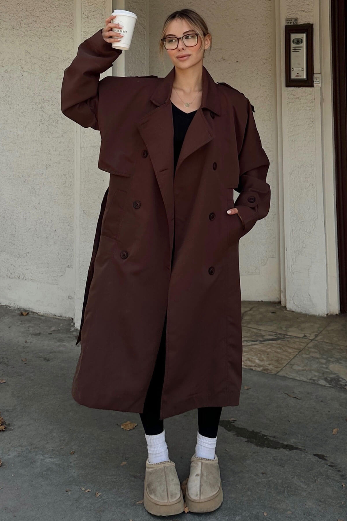 | Kahverengi Oversize Kuşaklı Kruvaze Yaka Apoletli Kadın Midi Trençkot | |