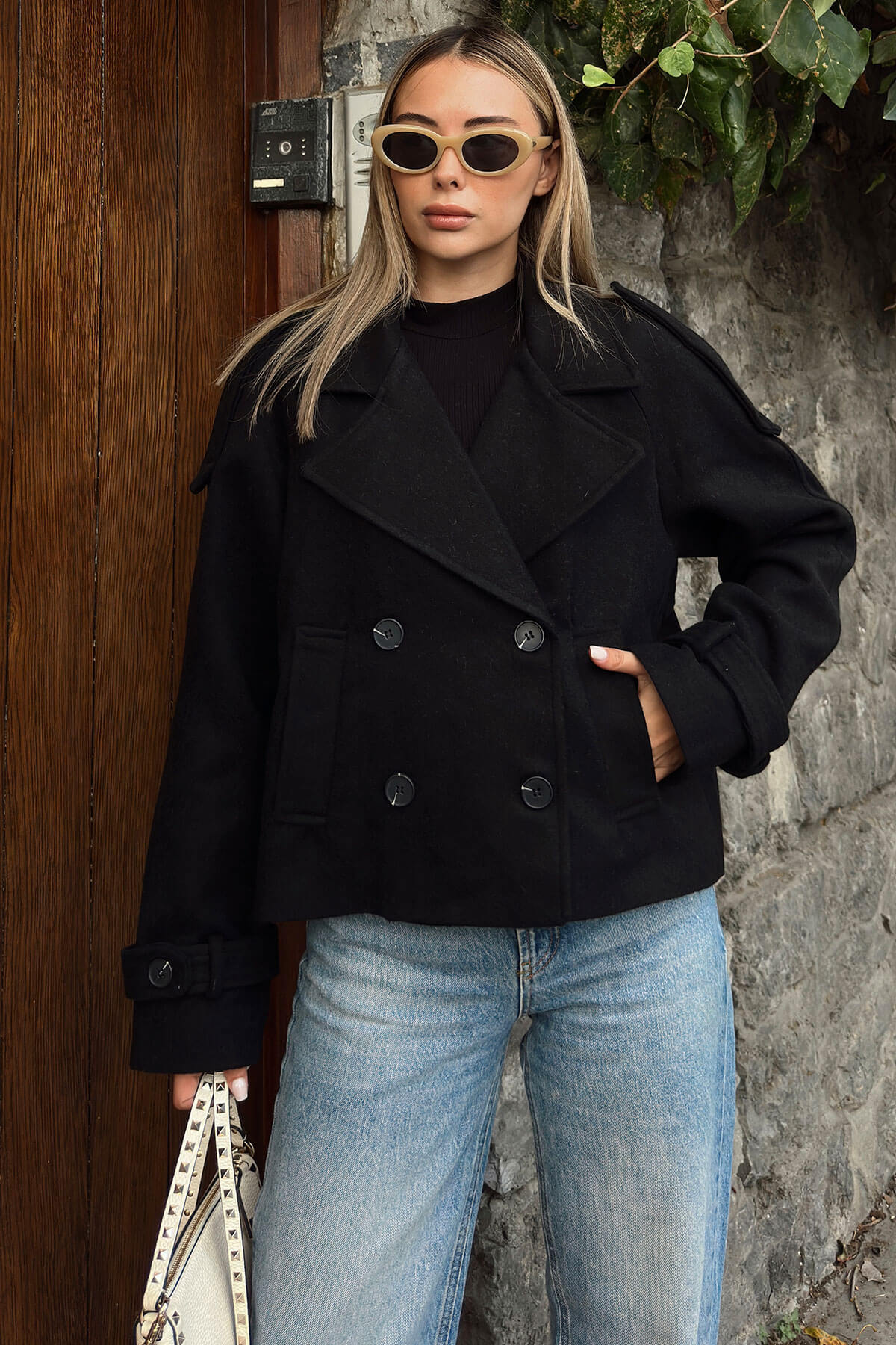 | Siyah Kruvaze Apoletli Manşet ve Cep Detaylı Kadın Crop Kaşe Mont | |
