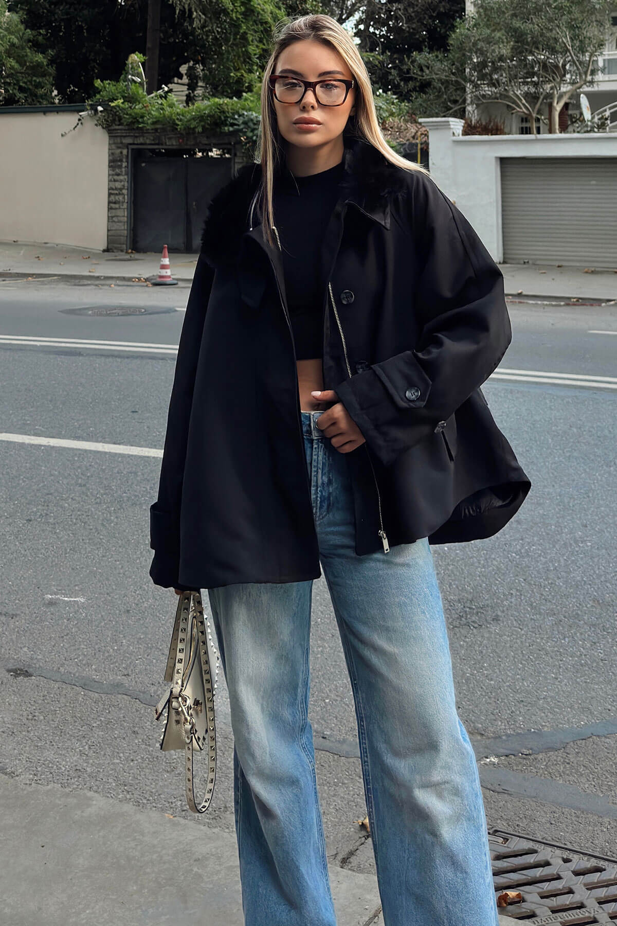 | Siyah Yakası Kürklü Manşet Ve Cep Detaylı Oversize Kadın Mont | |