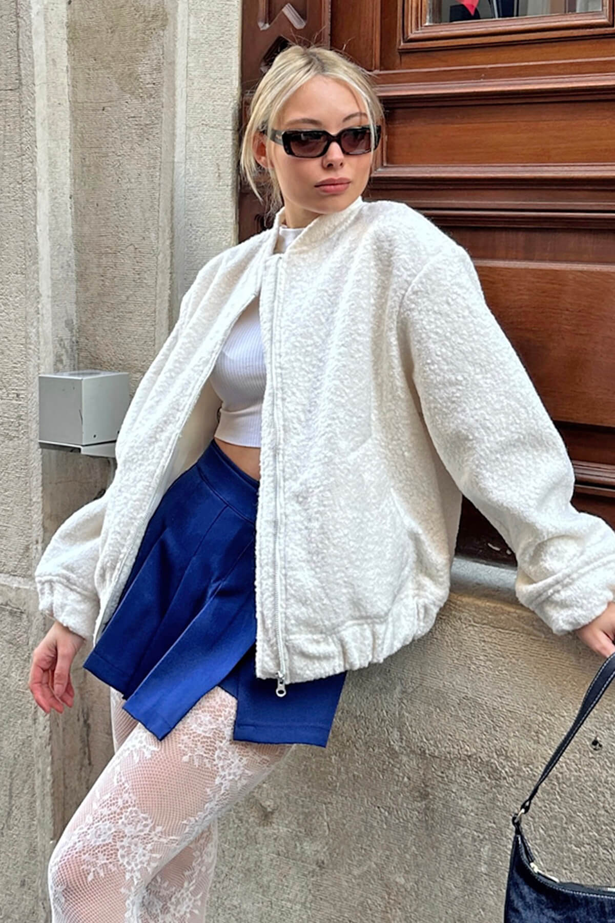| Beyaz Cepli Bisiklet Yaka Fermuarlı Buklet Kadın Bomber Ceket | |