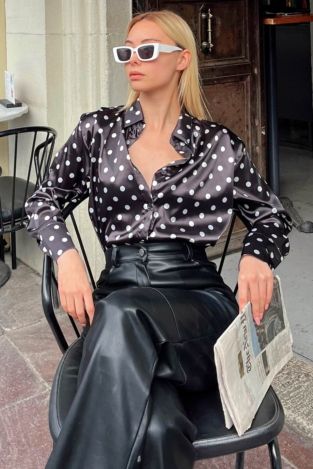 | Siyah Puantiye Desenli Manşet Detay Saten Kadın Gömlek | |