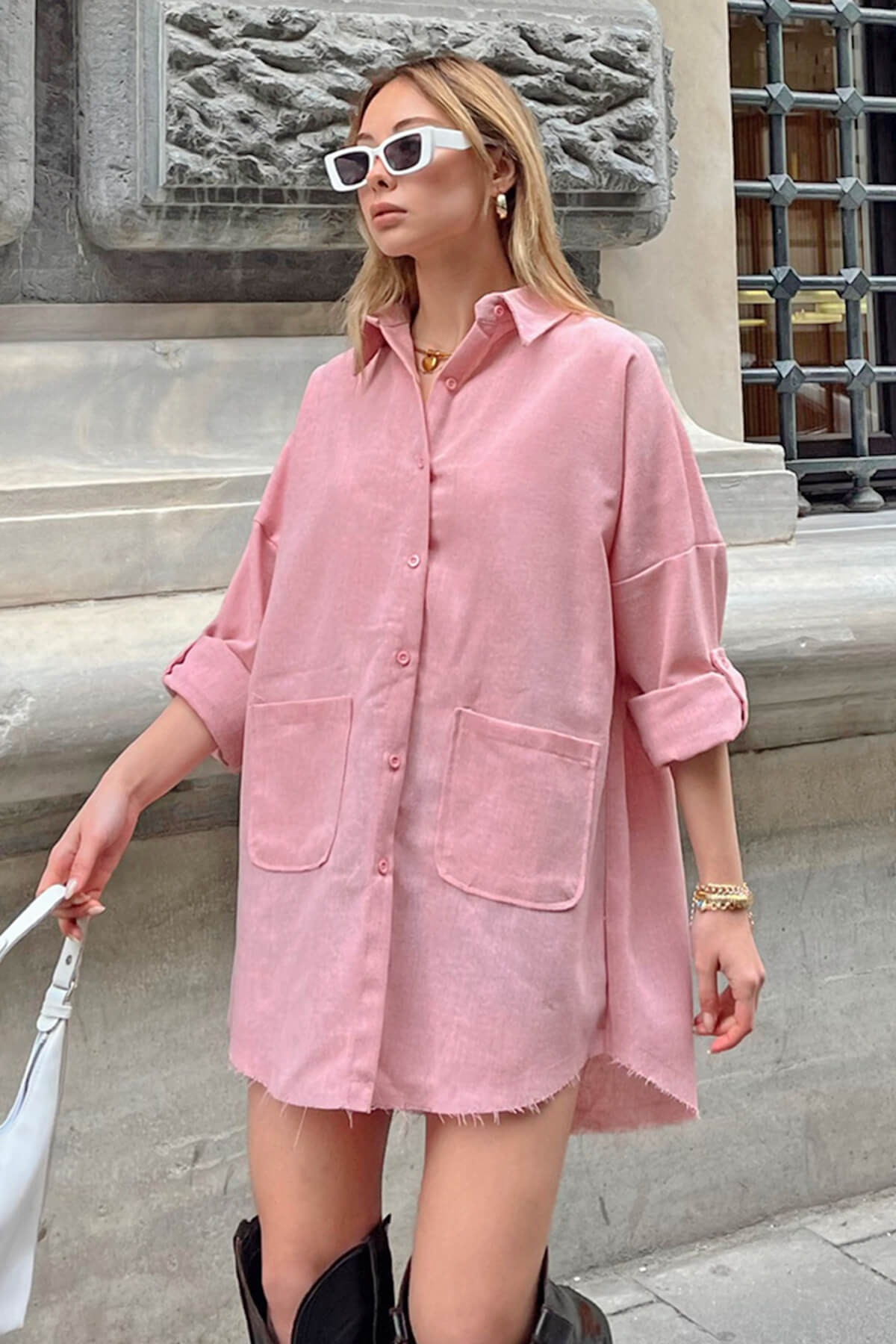 | Pudra Ham Keten Oversize Cepli Kadın Gömlek | |