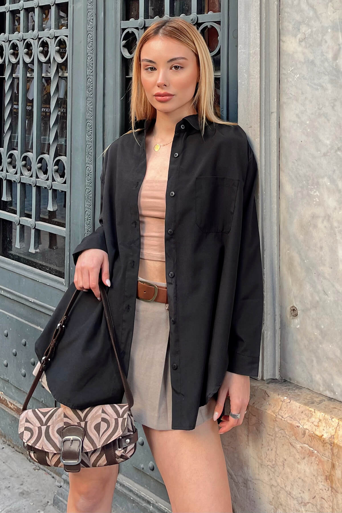 | Siyah A Pile Tek Cepli Kadın Oversize Gömlek | |