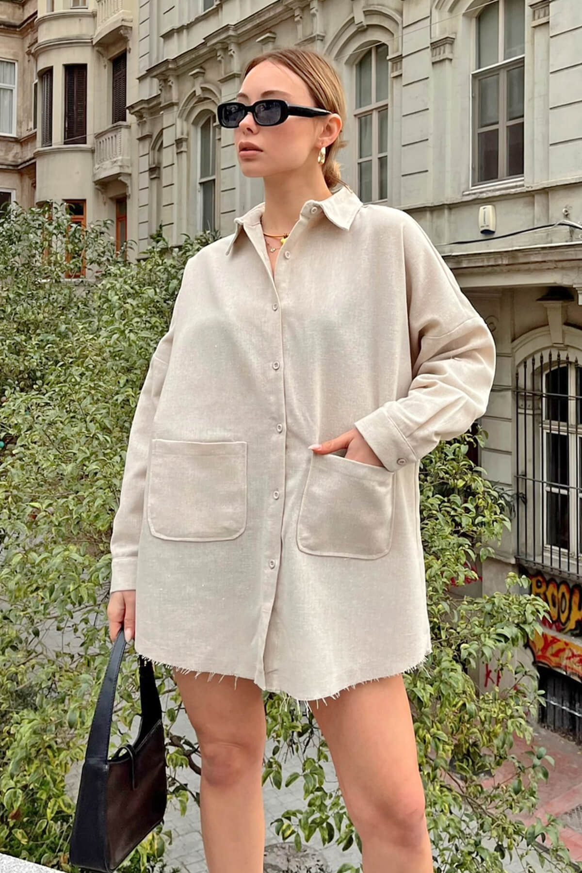 | Bej Ham Keten Oversize Cepli Kadın Gömlek | |