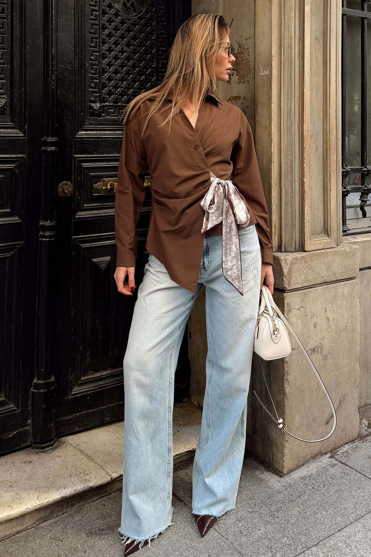 | Kahverengi Kruvaze Fular Bağlamalı Beli Lastikli Kadın Gömlek | |
