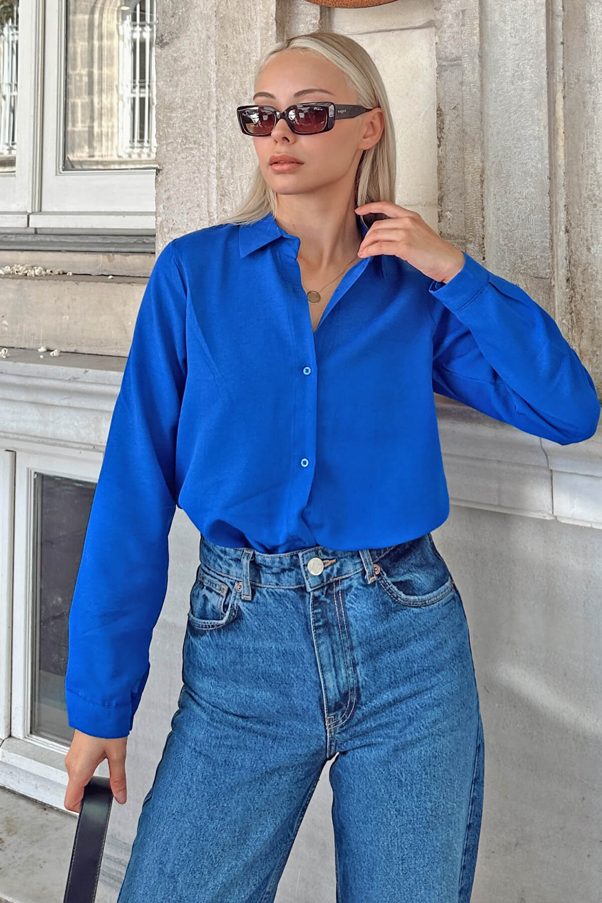 | Saks Mavisi Oversize Uzun Basic Kadın Gömlek | |