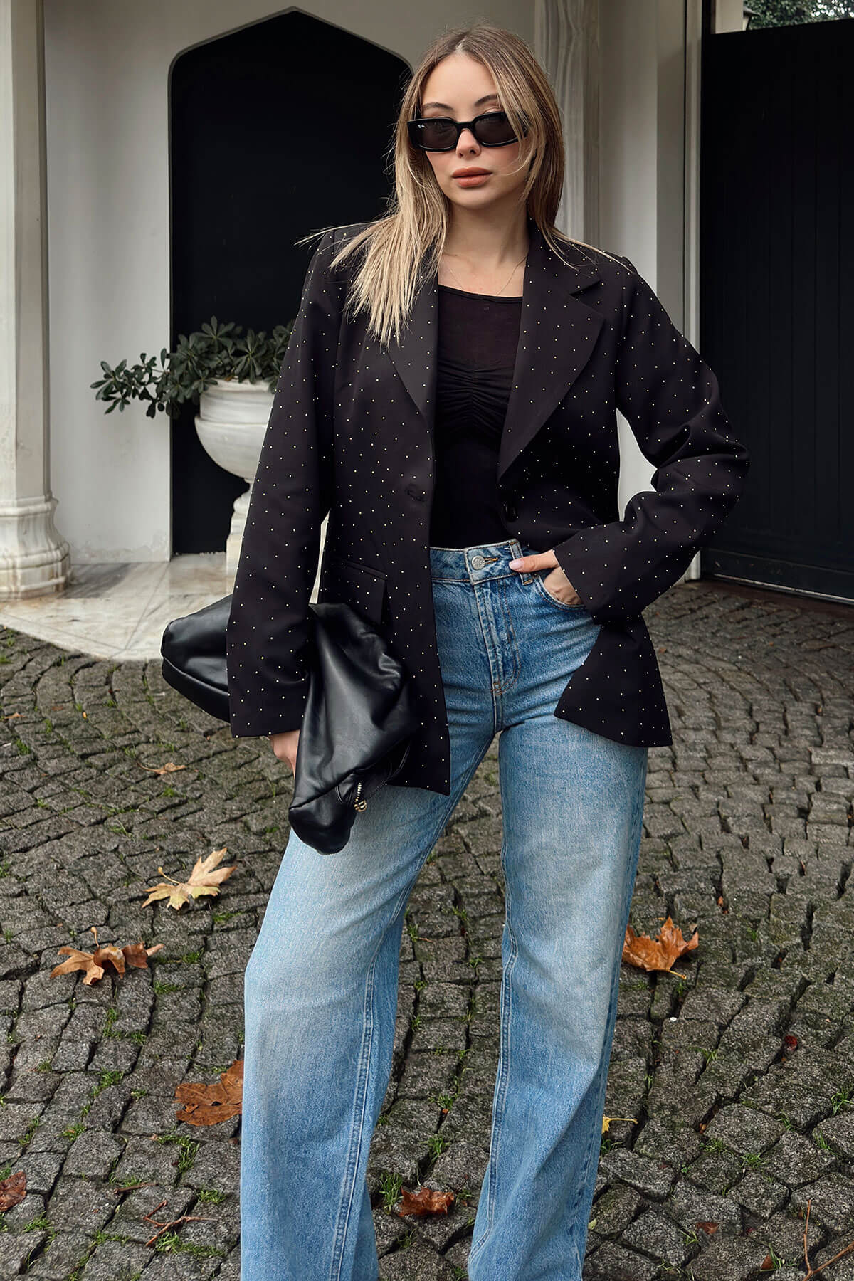 | Siyah Taş Detaylı Kruvaze Yaka Tek Düğmeli Kadın Blazer Ceket | |
