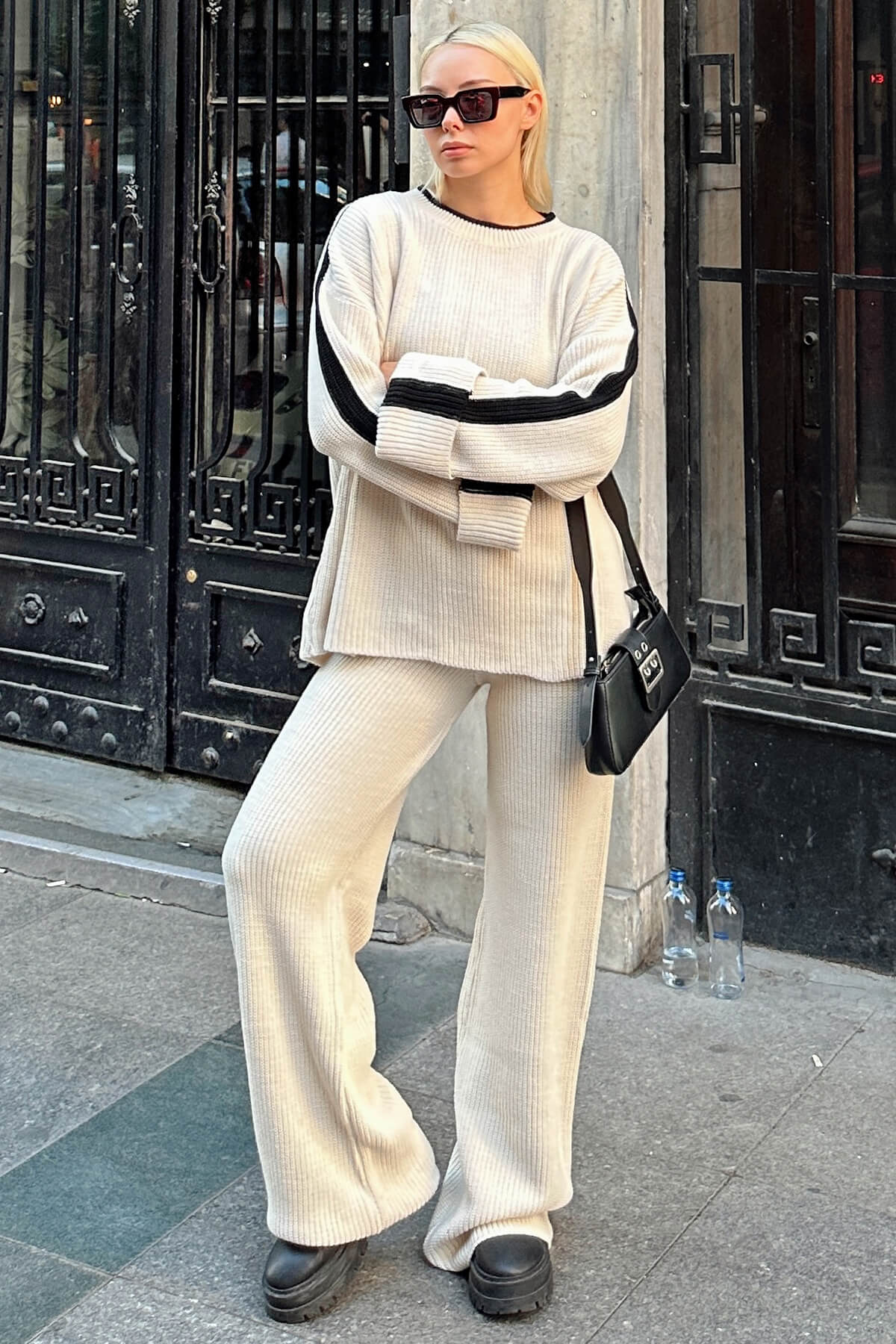 | Bej İntersiye Çizgili Yırtmaçlı Örgü Crop-Pantolon Kadın Triko Alt-Üst Takım | |