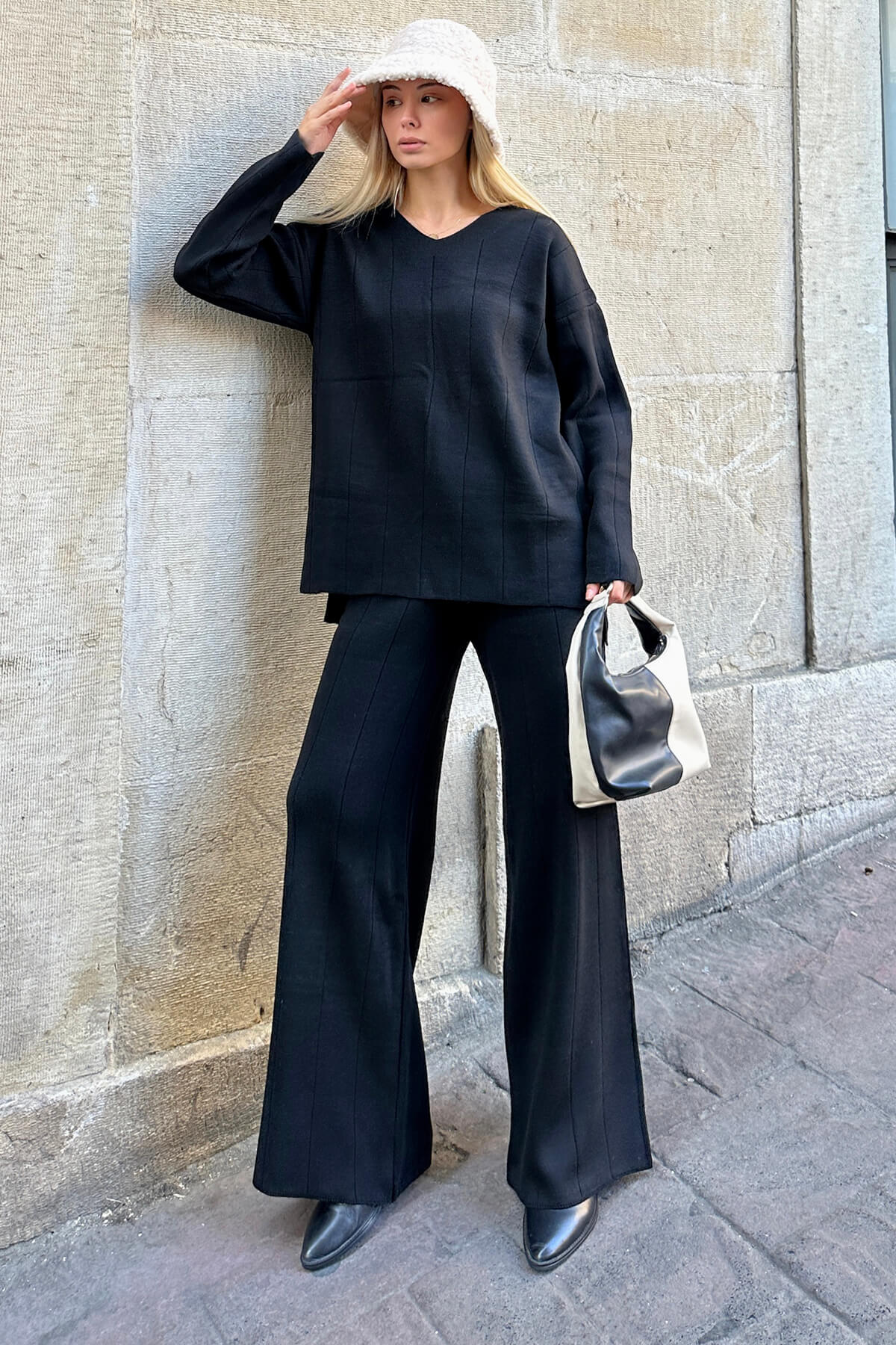 | Siyah V Yaka Örgü Kazak Pantolon Kadın Triko Alt-Üst Takım | |