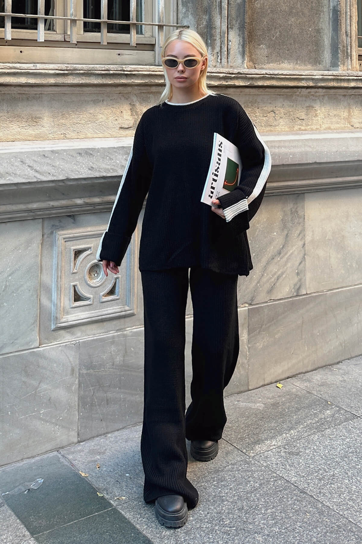 | Siyah Omuz Şerit Detaylı Bisiklet Yaka Duble Manşetli Kazak-Pantolon Alt-Üst Kadın Triko Takım | |