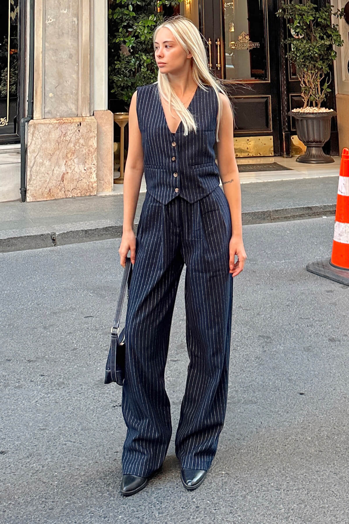 | Lacivert Norma Çizgili Düğmeli Yelek-Pantolon Kadın Alt-Üst Takım | |
