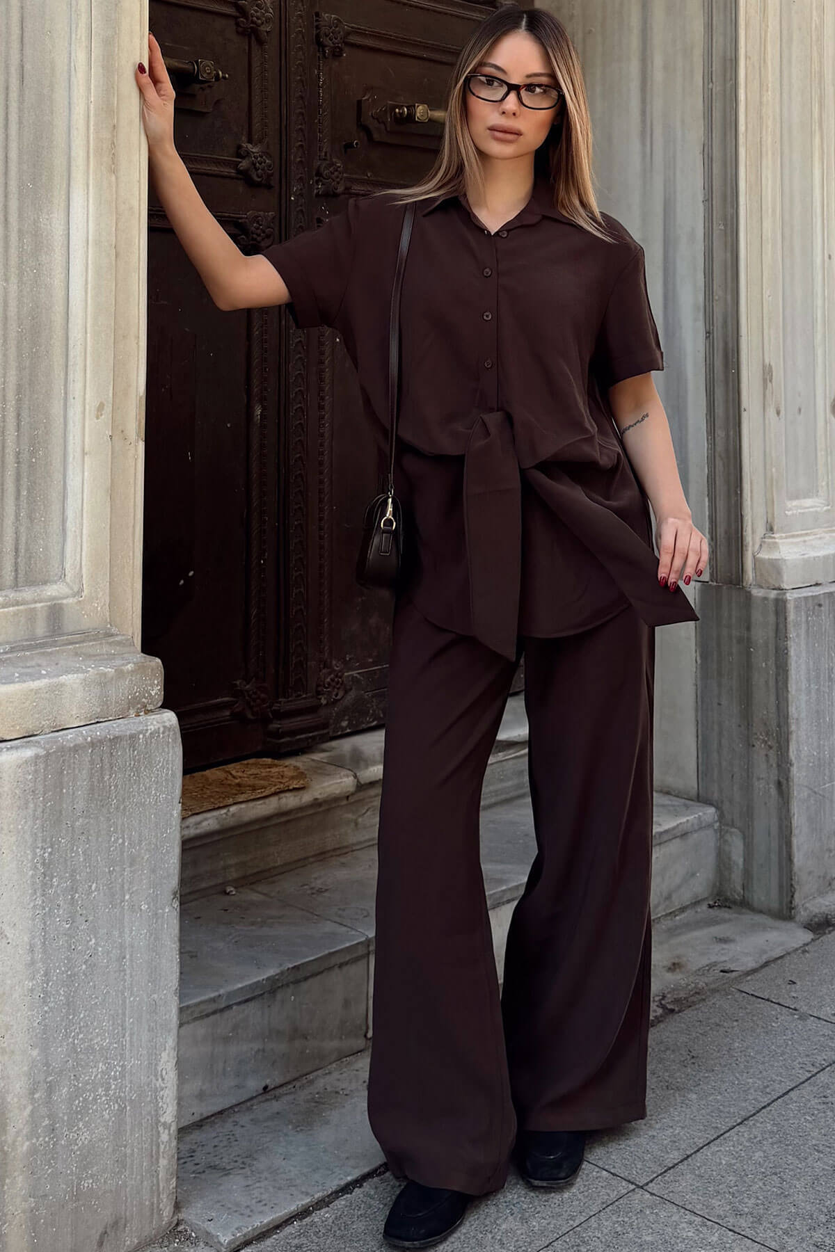 | Kahverengi Kısa Kol Bağlama Detay Uzun Gömlek-Pantolon Kadın Alt Üst Takım | |