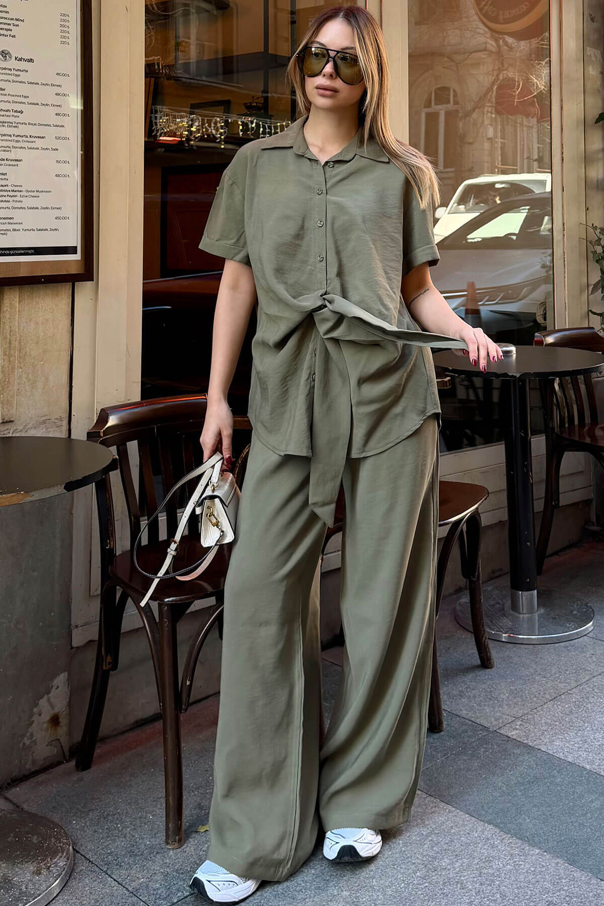 | Haki Kısa Kol Bağlama Detay Uzun Gömlek-Pantolon Kadın Alt Üst Takım | |